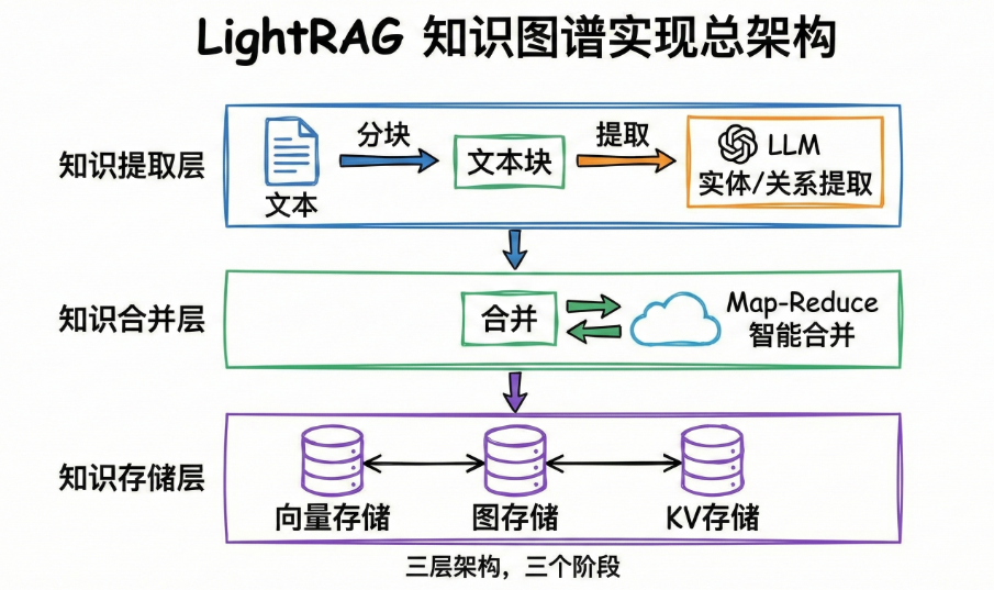 LightRAG 的知识图谱实现采用三层架构、三个阶段 的设计理念。整个系统从文本到知识图谱的构建过程清晰明确,每一层都有其特定的职责和优化策略。
