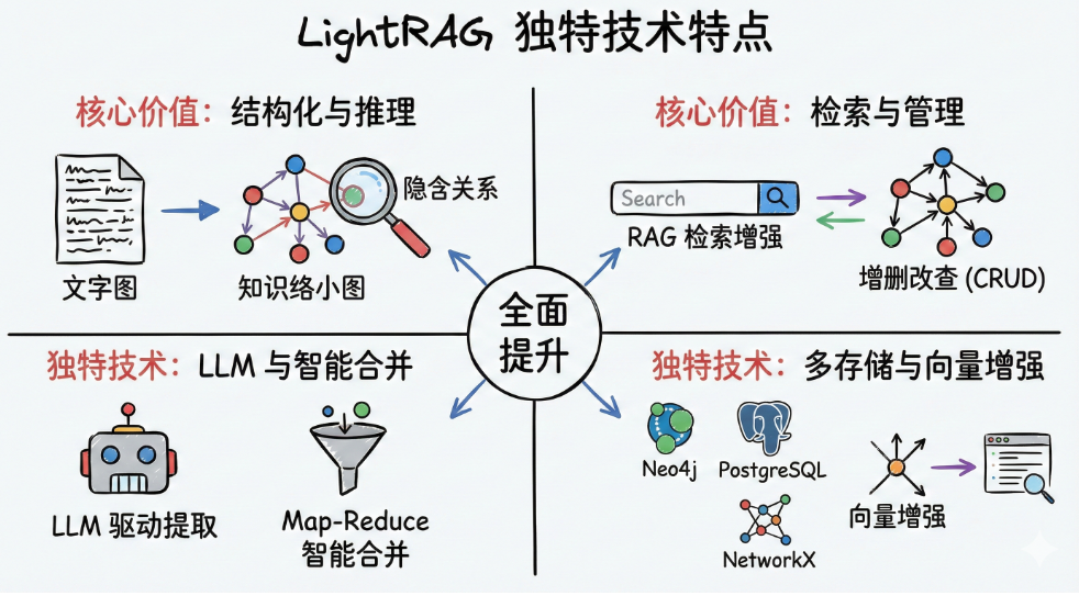 LightRAG 的知识图谱实现具有四个独特的核心技术特点,这些特点共同构成了系统的核心竞争力。