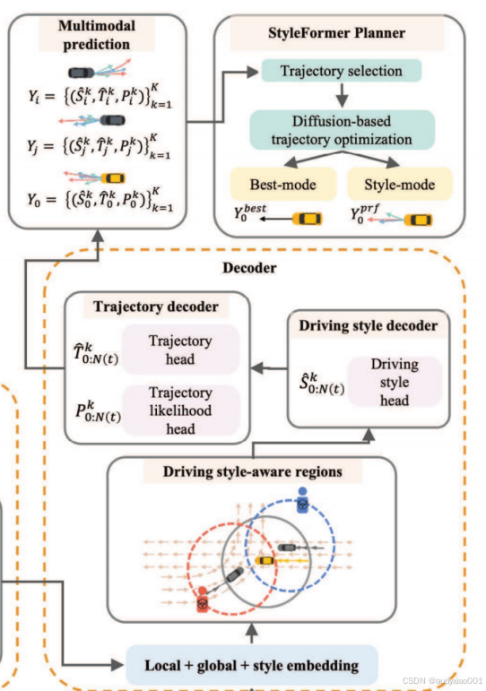 如图5,该模块负责将多模态预测转化为最终的自车规划轨迹。首先,轨迹选择器根据预设的驾驶风格偏好进行操作:例如,若选择"激进"风格,则从模型为自车预测的K条多模态轨迹中,挑选出被分类为"激进"且概率最高的一条作为候选。若无匹配风格,则选择整体概率最高的轨迹(最佳模式)。随后,候选轨迹被送入基于扩散模型的优化器。该优化器模拟一个迭代去噪过程:先在前向过程中对轨迹添加噪声,再在反向过程中,通过一个学习网络逐步去噪,同时在每一步都施加道路边界约束(使轨迹贴近车道中心)和车辆动力学约束(如加速度、曲率上限)。如图5所示,经过扩散优化后,原始的预测轨迹(可能不平滑或轻微越界)被修正为一条完全可行、平滑且安全的最终规划轨迹,显著提升了实际部署中的安全性。
