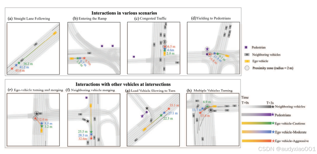 如图6,又通过8个典型城市交通场景的轨迹可视化,直观展示模型在不同交互场景下的风格适配能力、避障安全性与轨迹合理性,是对定量结果的关键补充。
