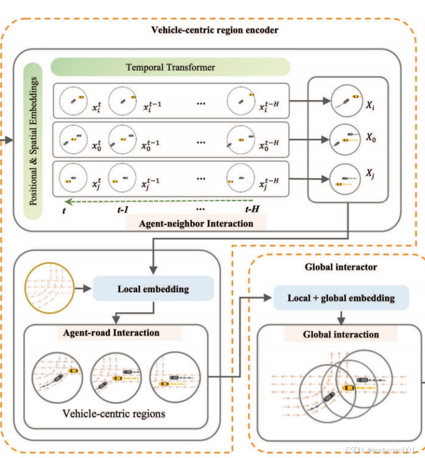 设计了一种基于无监督聚类(K-means)的短期驾驶风格自动标注方法,从大规模车辆轨迹数据中提取速度、加速度、横摆角速率等多维度特征,将驾驶风格客观地归类为谨慎(Cautious)、适中(Moderate)与激进(Aggressive)三类。进而,提出了一种向量化的车辆中心区域表示法,将地图元素、历史轨迹及驾驶风格标签统一编码,增强了模型对相对运动与行为模式的感知效率与旋转不变性。