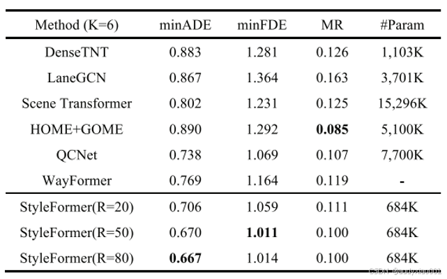 在nuScenes数据集上,StyleFormer同样在minADE指标上领先(K=10时达0.903),进一步证明了其强大的泛化能力。与专注于目标预测的方法(如Goal-LBP)相比,StyleFormer在MR指标上表现接近,但在轨迹整体形状精度(minADE)上优势明显,说明其生成的全轨迹更贴合真实运动模式。