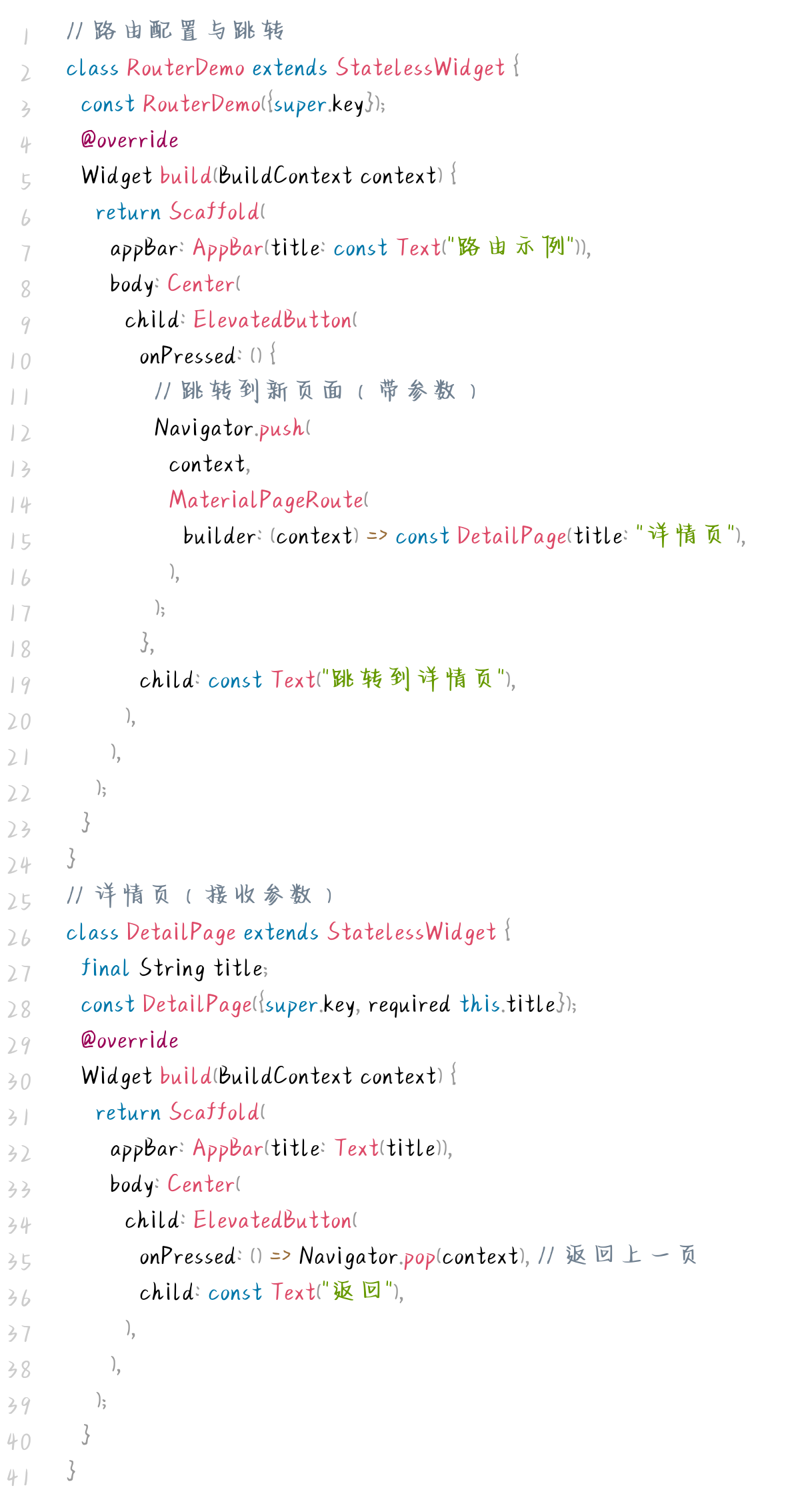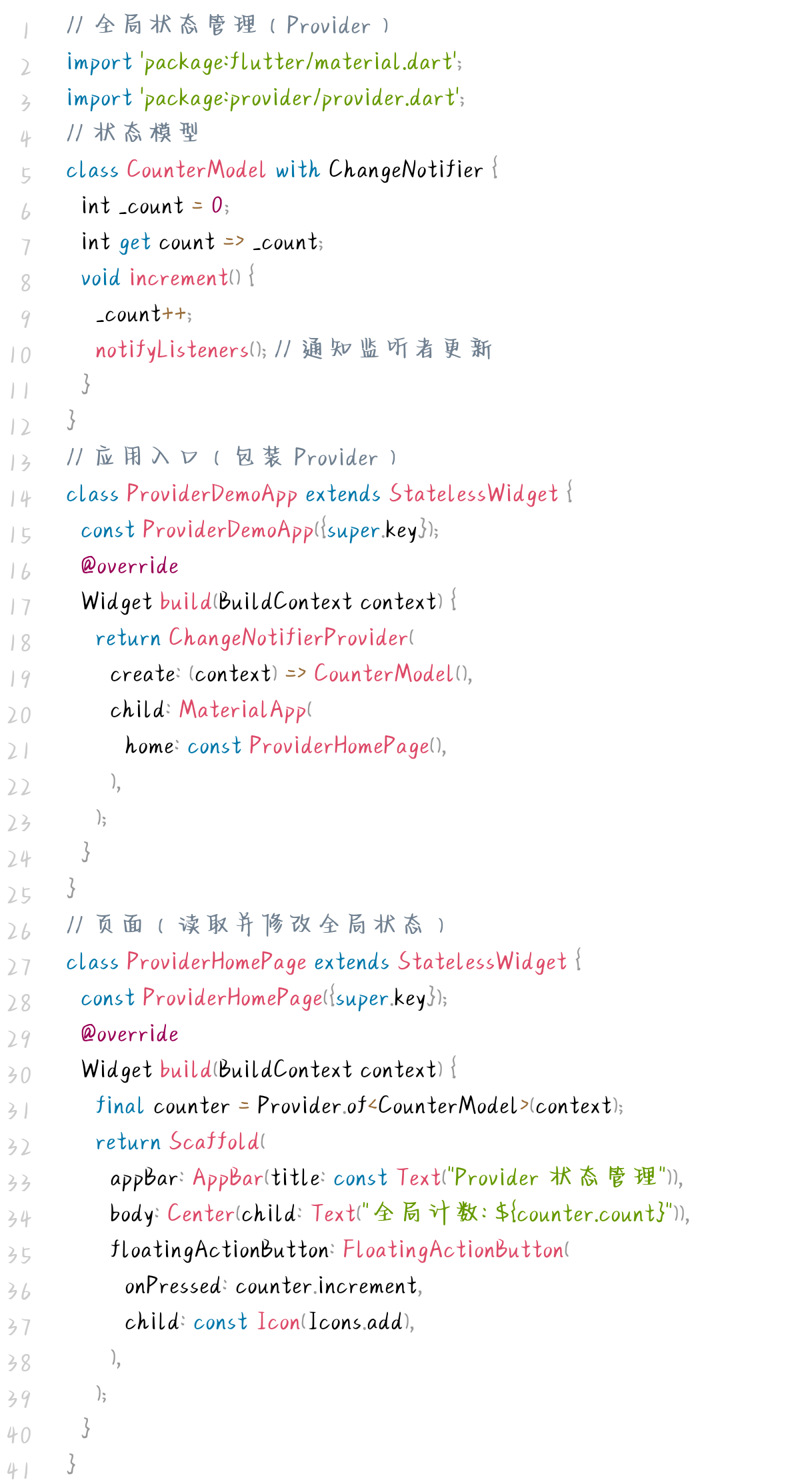 - 全局状态:使用 Provider 框架(轻量、易用),通过 ChangeNotifier 存储状态, Provider.of 或 Consumer 读取状态,示例如下: