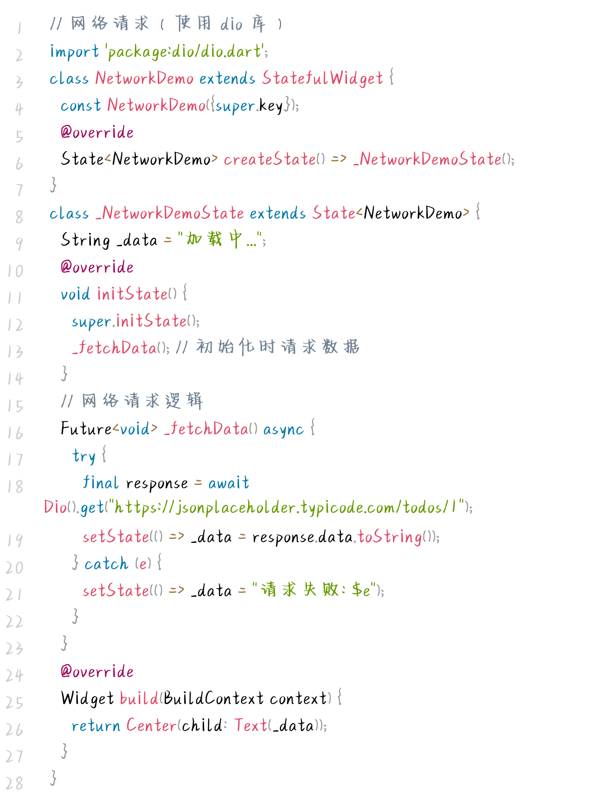 - 异步编程:通过 Future 、 async/await 处理异步操作(如网络请求、文件读写),语法简洁且易读;