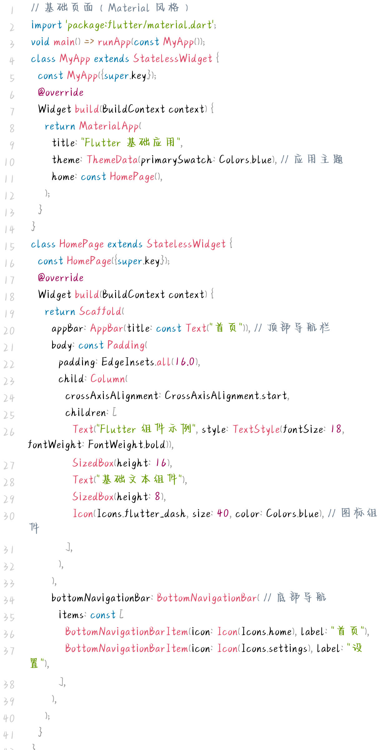 - 风格组件: MaterialApp (Material 设计风格应用容器)、 Scaffold (页面骨架,包含 AppBar、Body、BottomNavigationBar)、 CupertinoApp (iOS 风格应用容器)。