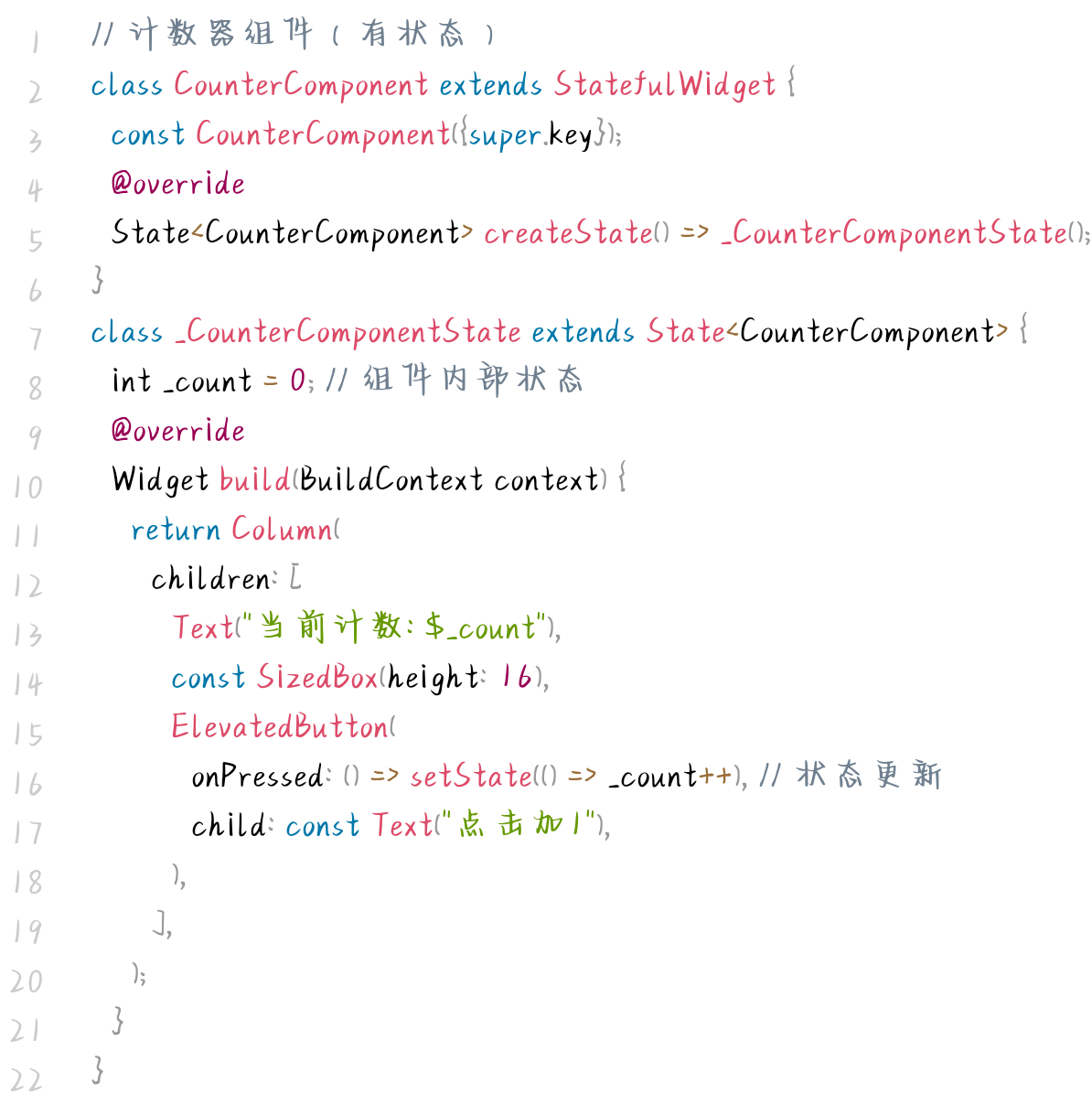 - 有状态组件(StatefulWidget):状态可变的组件(如按钮、输入框),通过 State 类管理状态,状态变化时调用 setState(() {}) 触发重建。
