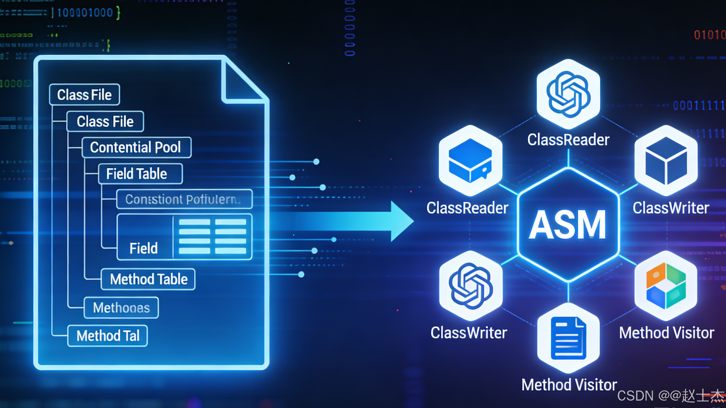 ASM 是一个轻量级、高性能的 Java 字节码操控框架,它基于字节码指令集操作,能够直接读取、修改和生成 Java 字节码文件(.class文件),是 Java 字节码操作领域的核心工具之一。常见的开源框架如Spring、MyBatis等,都在底层使用ASM来实现核心功能(如Spring的AOP动态代理、MyBatis的Mapper接口动态实现)。