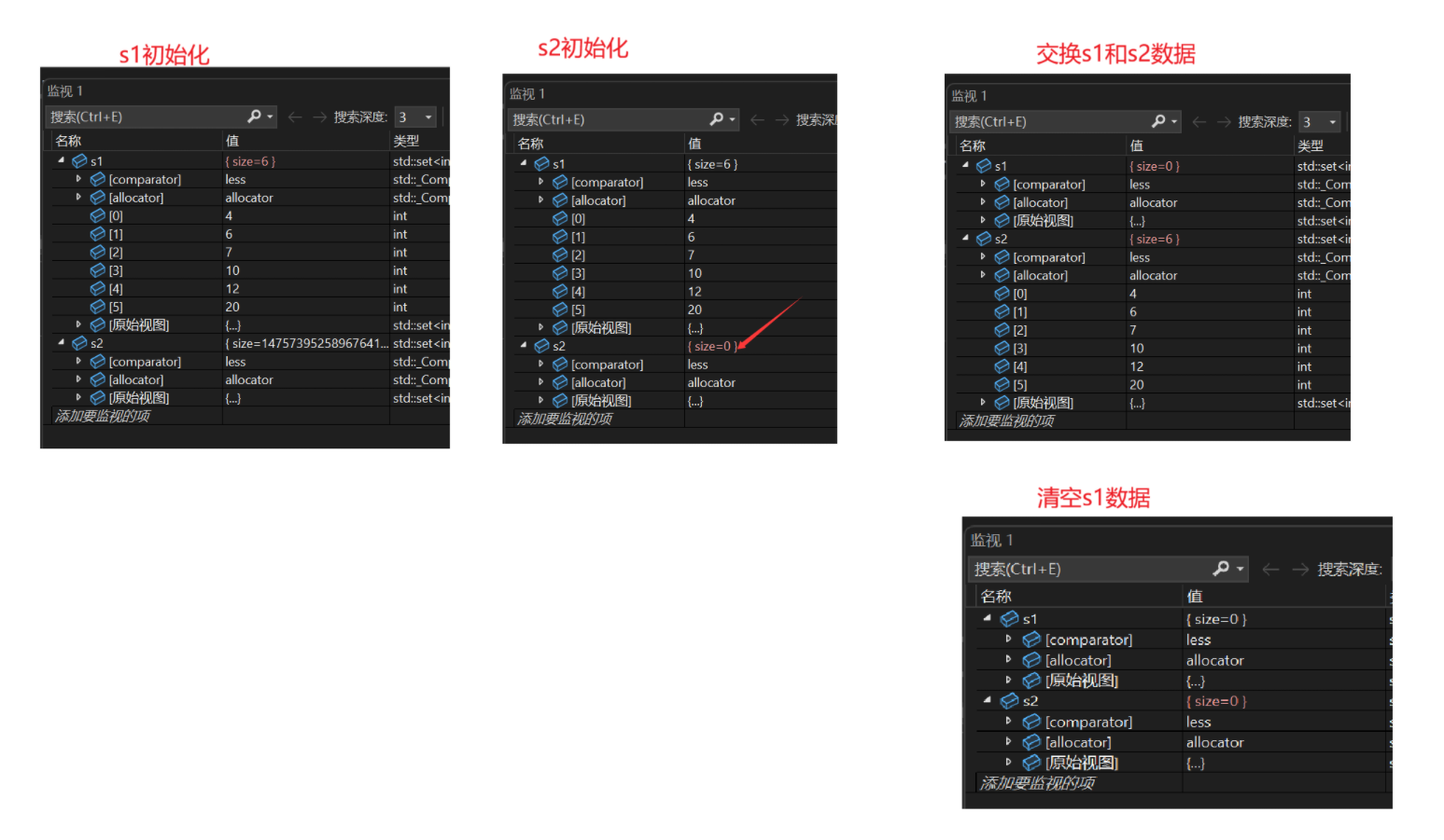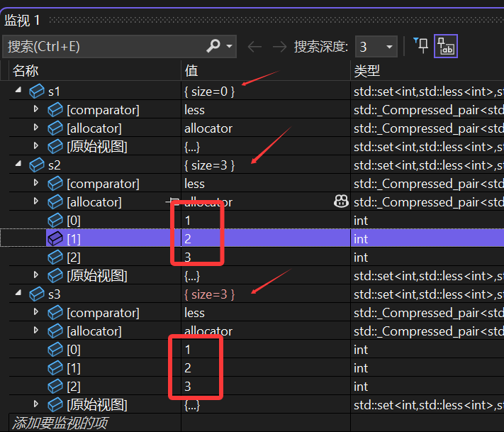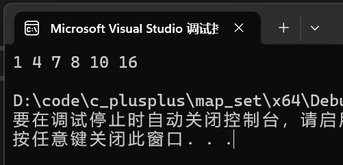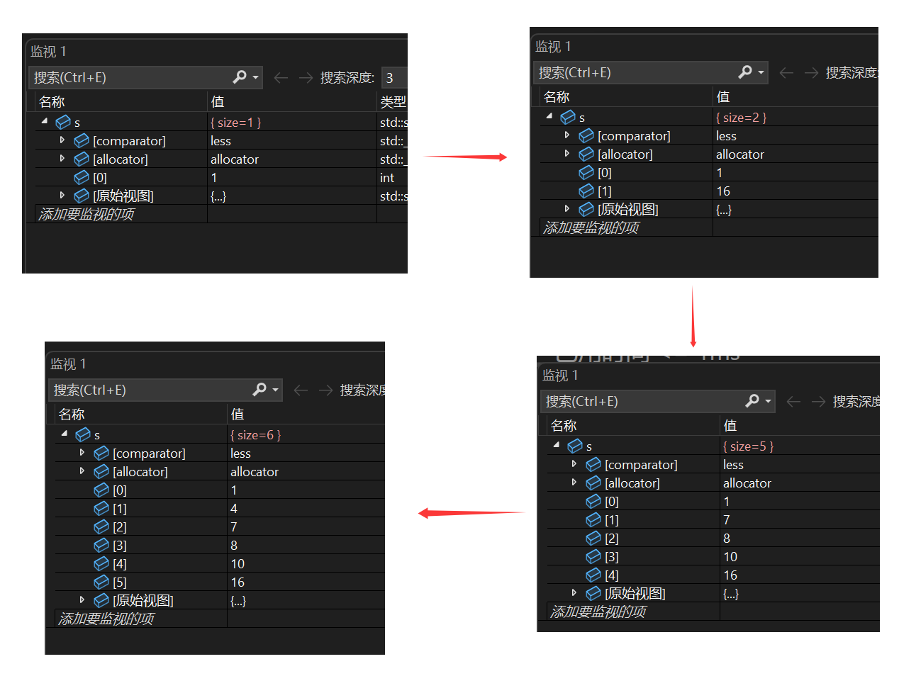 从调试窗口可以看到,16并没有插入到我们给的s.begin()位置上,而是根据二叉搜索树的插入逻辑来进行的插入。而且对于重复插入的值,并没有多次插入到set结构中