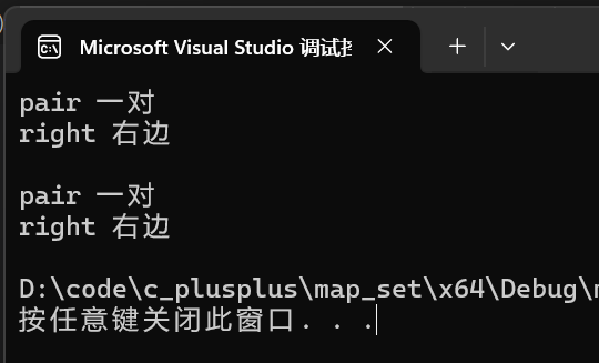 插入+修改:"right"没有在map数据中,插入"right",value值调用对应类型的默认构造,operator[]返回value值的引用,修改为"右边"
