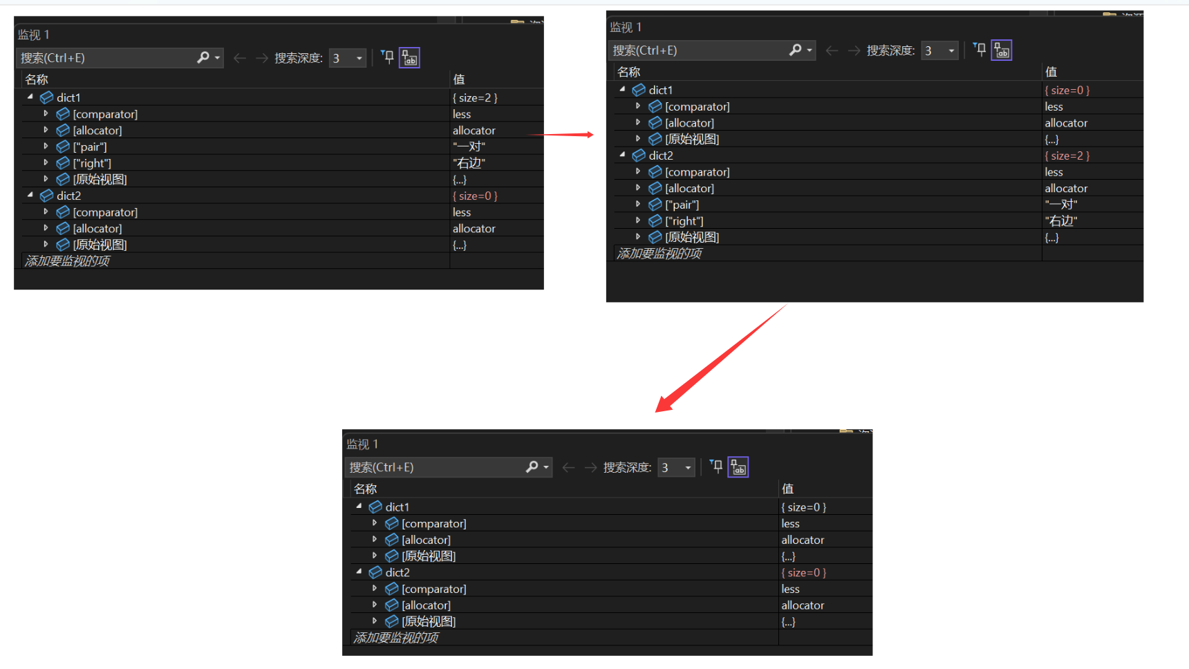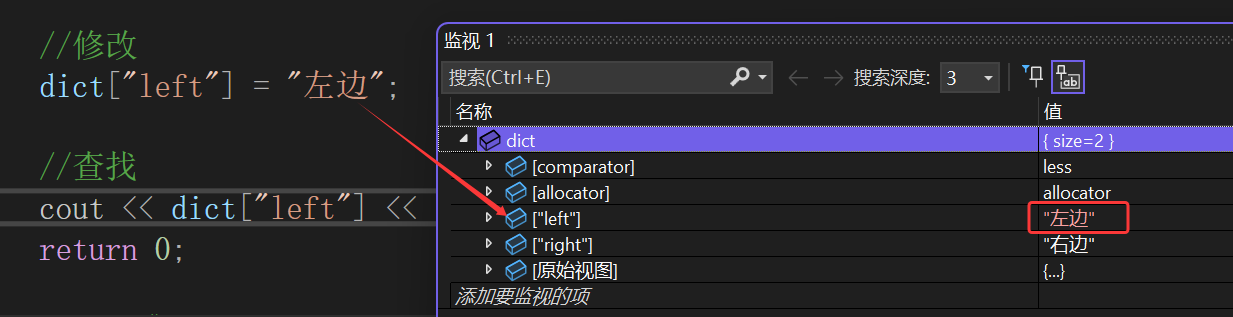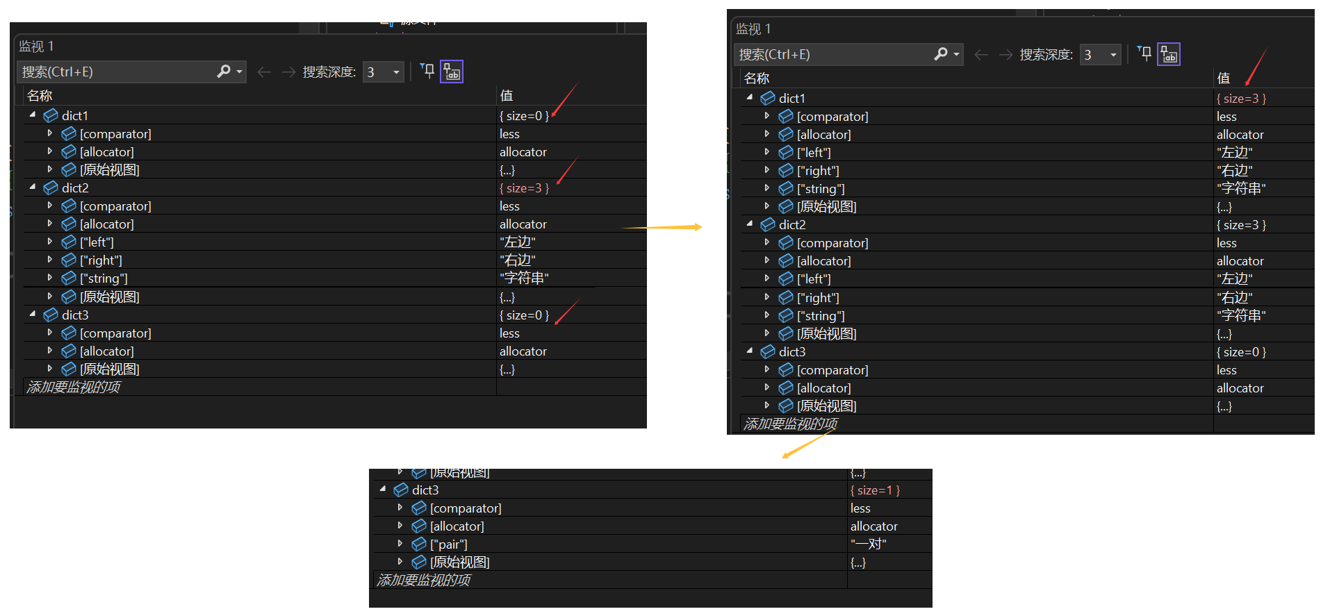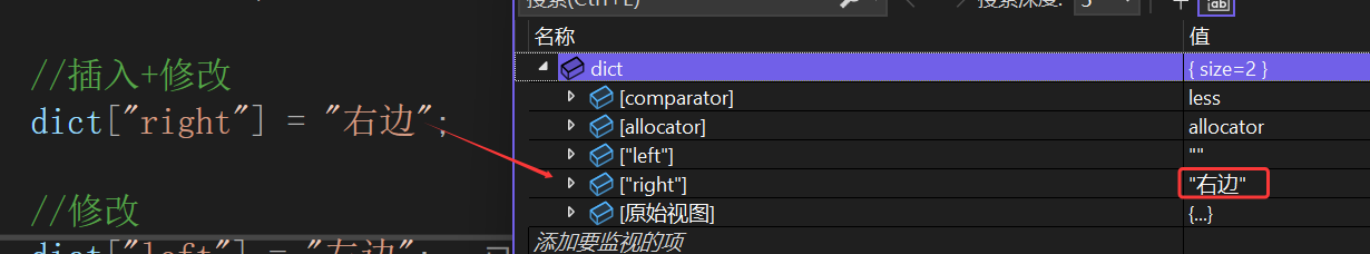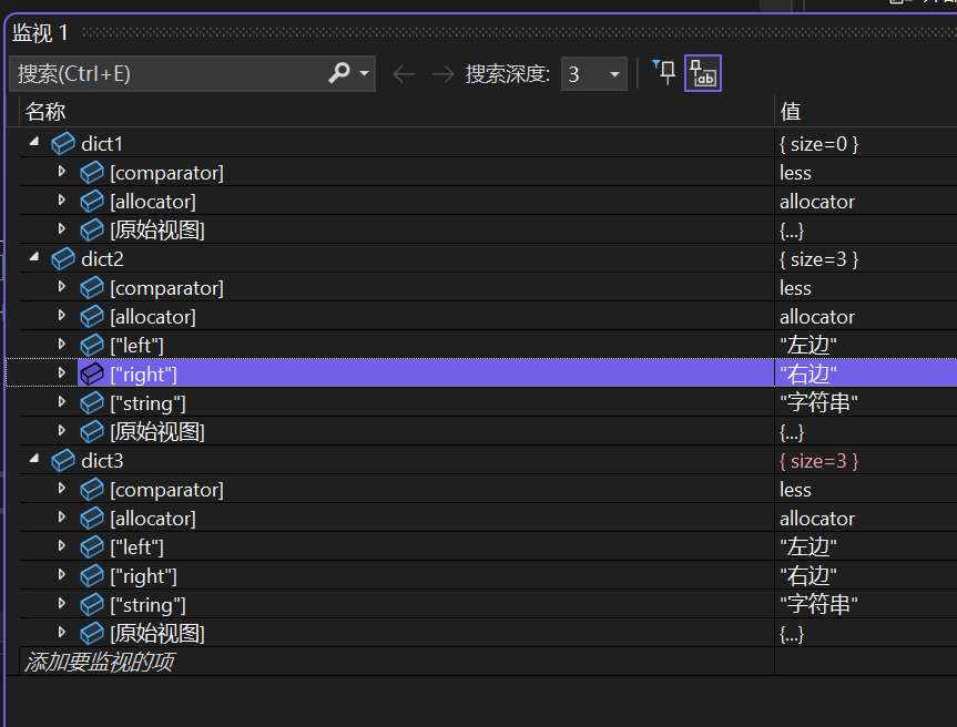 - 将dict2赋值给dict1,dict1的size变成3,在监视窗口可以看出dict1中有了{"left", "左边"}, {"right", "右边"}, {"string", "字符串"}
