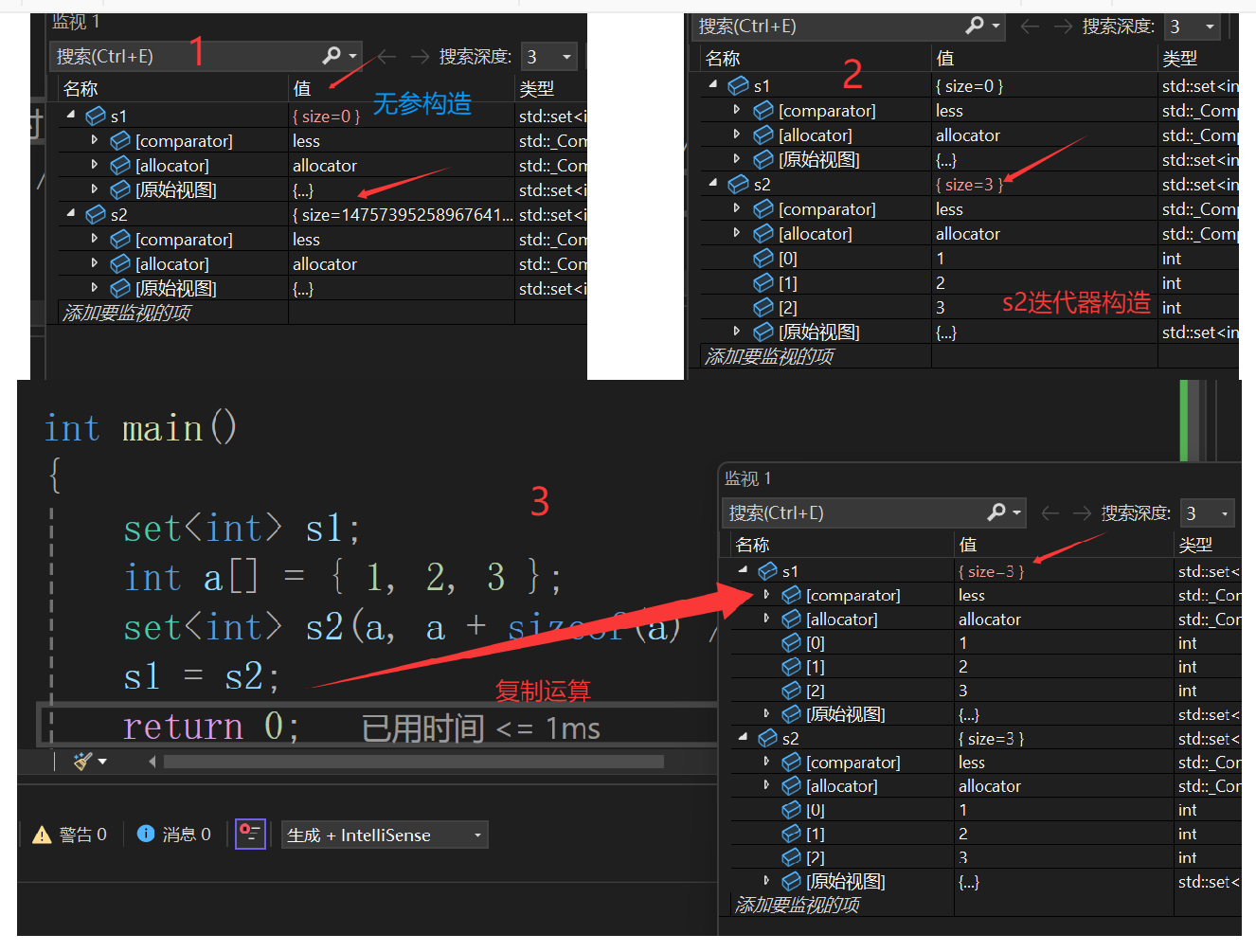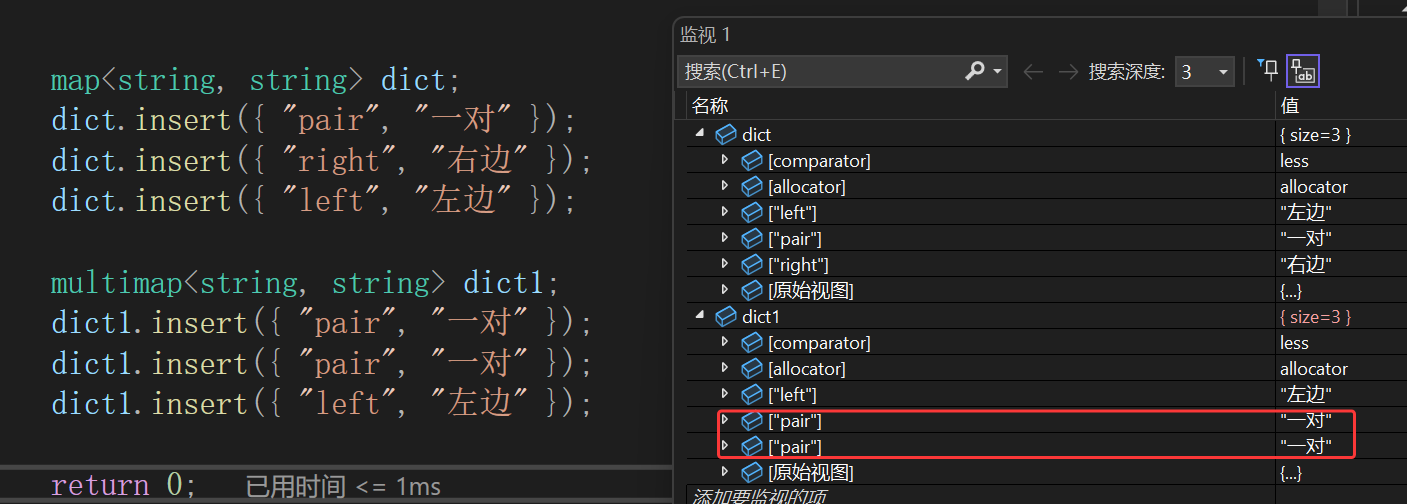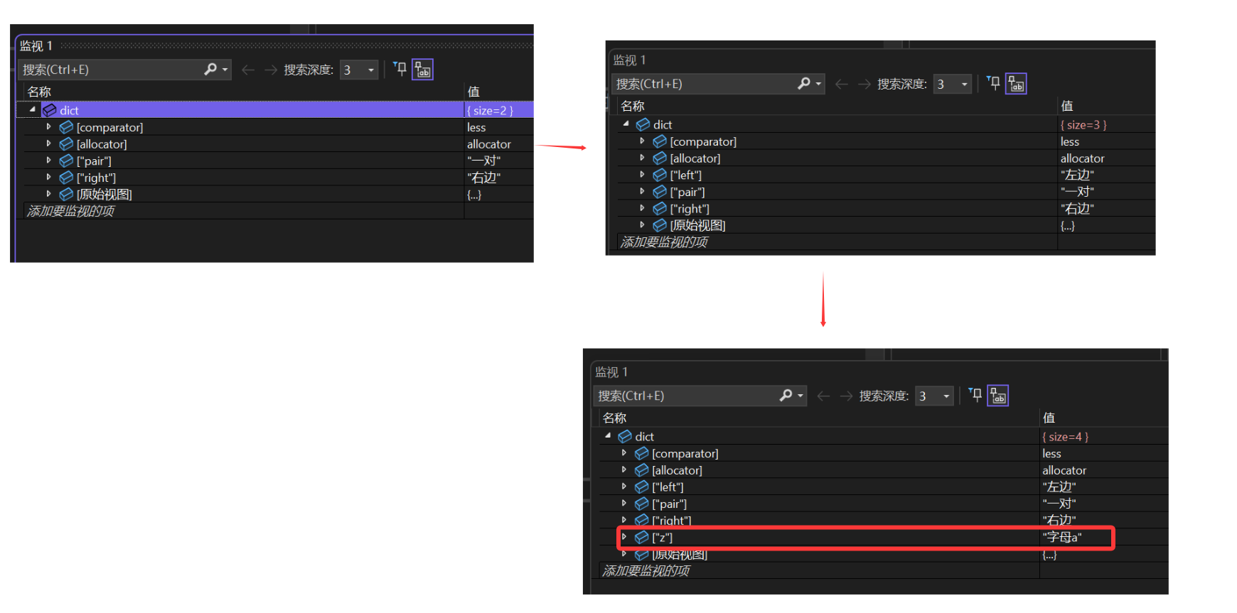 - 将dict2赋值给dict1,dict1的size变成3,在监视窗口可以看出dict1中有了{"left", "左边"}, {"right", "右边"}, {"string", "字符串"}