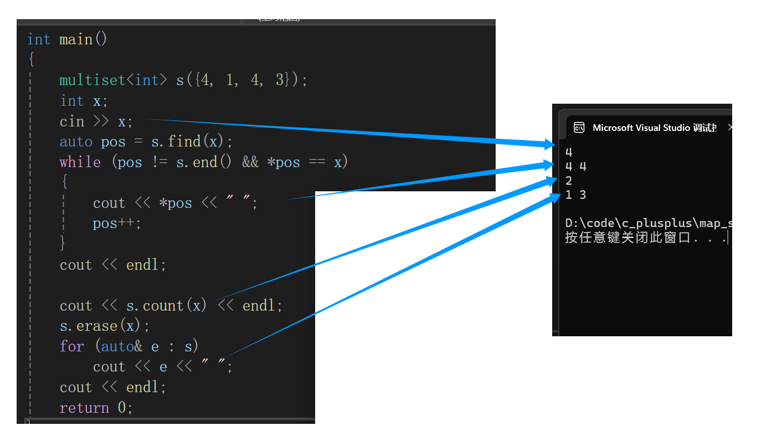 - erase传入一个key值来删除key值对应数据,并返回删除了多少个key看,这和set设计思路是一样的为multimap接口做准备