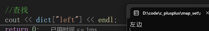 - 查找:dict["left"],left已经存在,插入失败,但是插入失败也能拿到指向"left"的迭代器,再返回value的引用,因此就能查找到"left"对应的value值