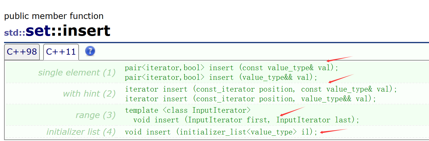 - 插入一个key(val)(这里的value_type(value)和key_type(key)一样都是T类型,T:set中存储的数据类型),观察其返回的是一个键值对pair类型,其中第一个数据first是插入位置的迭代器,第二个位置是是否插入成功,由于set中的key值不能重复且只能有一个,如果key值已经有了,那么返回的是原key位置的迭代器以及false,如果key值没有,那么返回的是新插入key位置的迭代器以及true,由于return不能返回两个值,所以如果想返回多个值,必须放在一个结构中进行返回,这里是放在了键值对pair中进行返回
