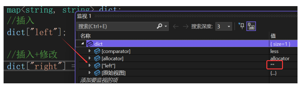 - 插入(基本不会这样用):当map中没有"left",那么会插入"left"成功,value值调用对应类型的默认构造