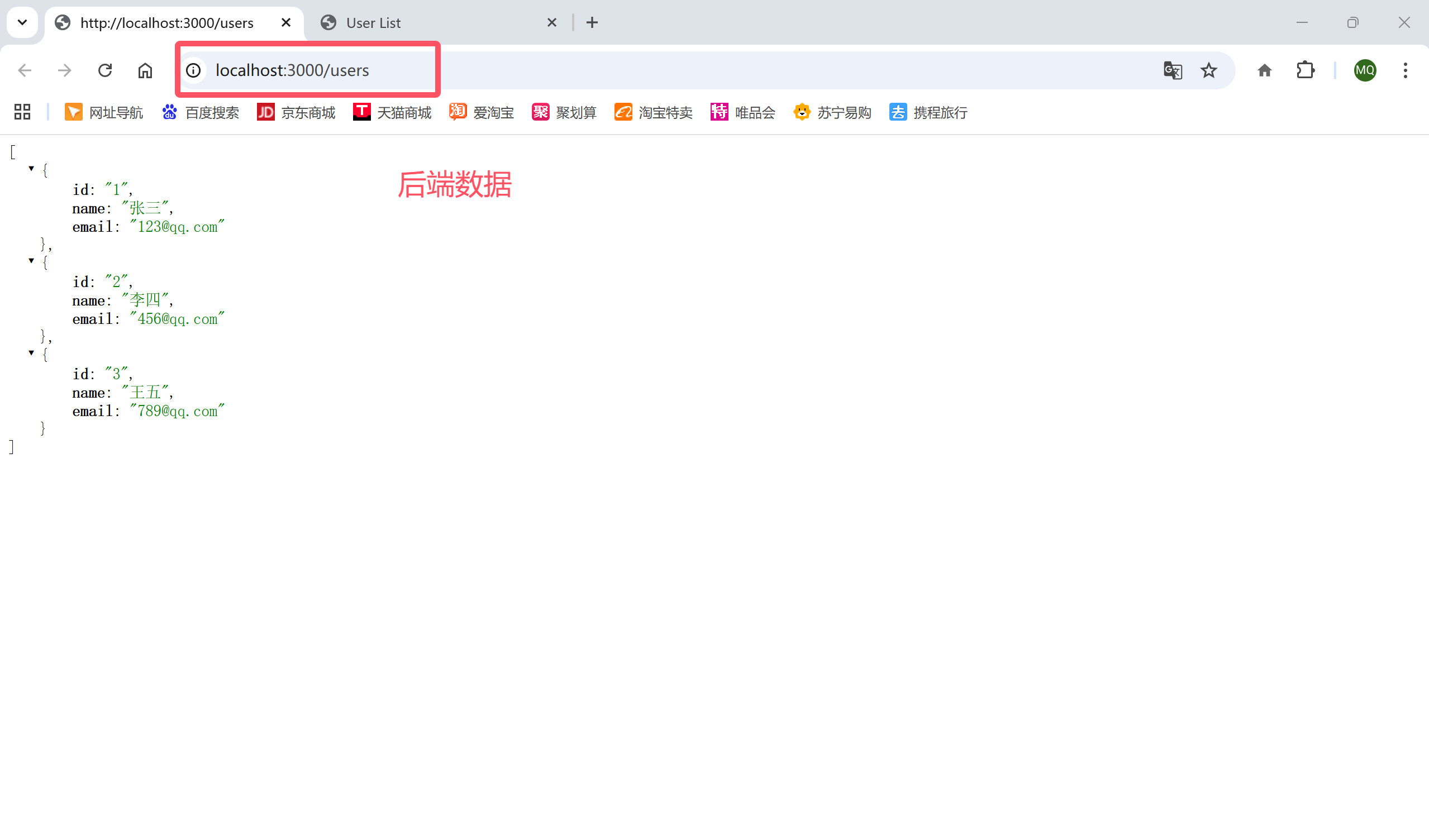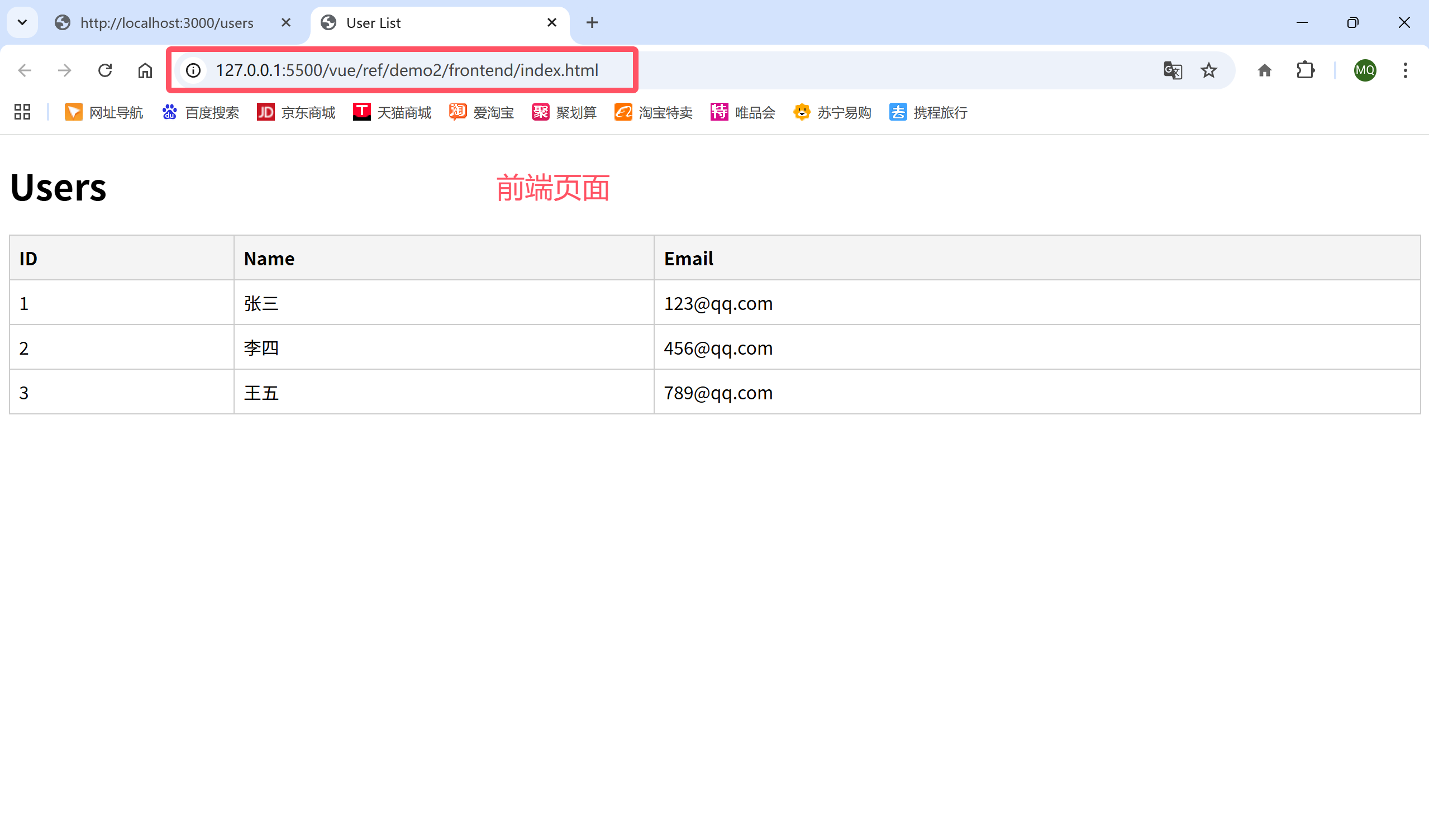 这段代码翻译成人话就是:"后端大哥,把用户数据给我呗~ 我自己会摆!" 数据从后端接口3000 获取,前端有了自己的 5500 端口,彻底实现 "住址独立"------ 就像孩子长大了,终于有了自己的房间,不用再跟爸妈挤一张床🛏️。