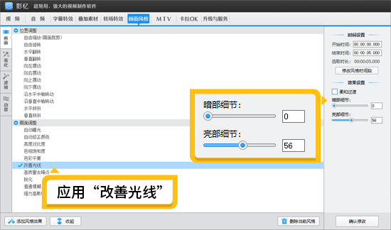 选"改善光线":直接减少"暗部细节"(避免暗部太黑),增大"亮部细节"(让画面整体变亮),数值根据视频实际情况调,比如暗部细节设为0,亮部细节设为40-60,画面会立马通透。