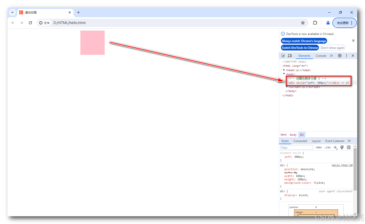 设置缓动动画 移动 300 像素后 , 最终 div 元素停留在的位置 对应的 left 属性值是 296.4px ;