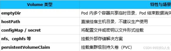 Volume 是挂载到 Pod 里的目录,生命周期跟随 Pod。常用 Volume 类型: