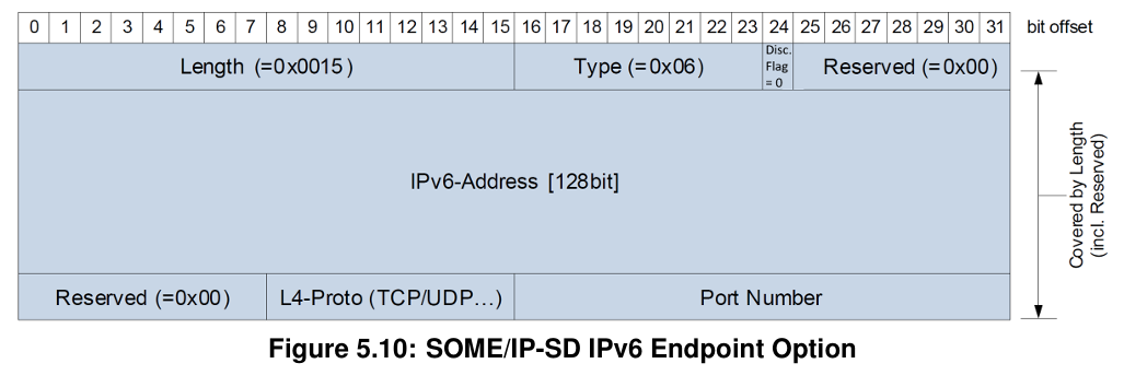 SOME/IP-SD 使用IPv6 Endpoint Option去标记一个Endpoint。Endpoint包含发送者的IP地址、传输协议(TCP/UDP)、Port号。Port号同时适用与Event和Notification Event