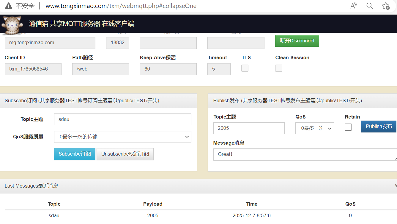 9.通信猫提供的免费Broker:mq.tongxinmao.com,TCP端口:18830,WS端口:18832,用户/密码:空,如下: