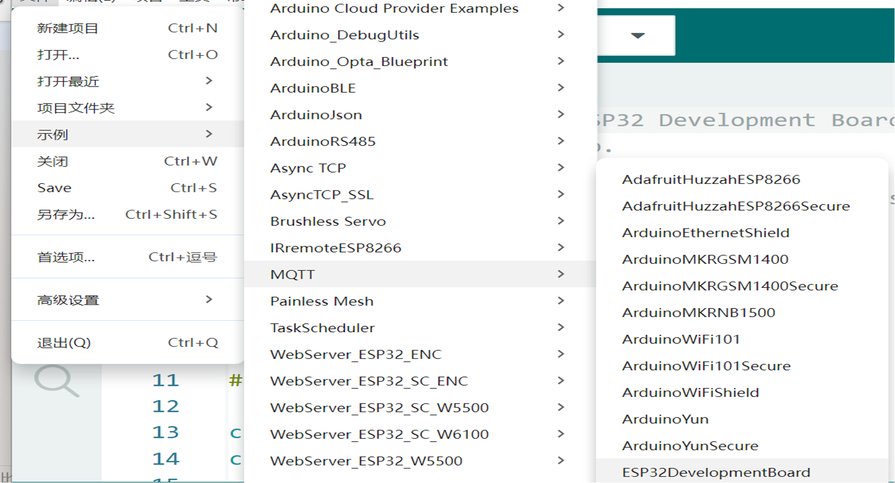 4.按照顺序:示例->来自自定义库的示例->MQTT->ESP32DevelopmentBoard,打开Demo程序:
