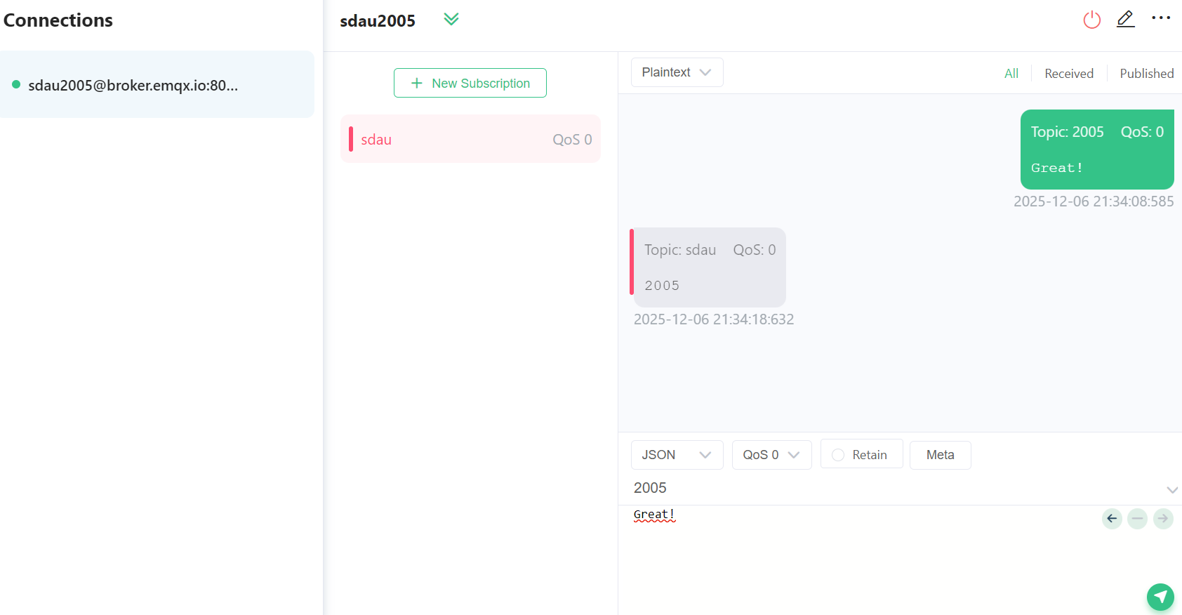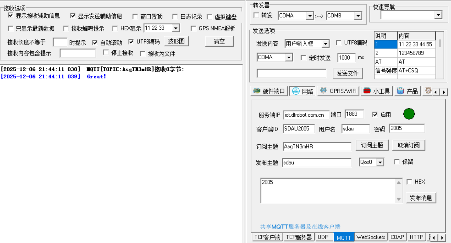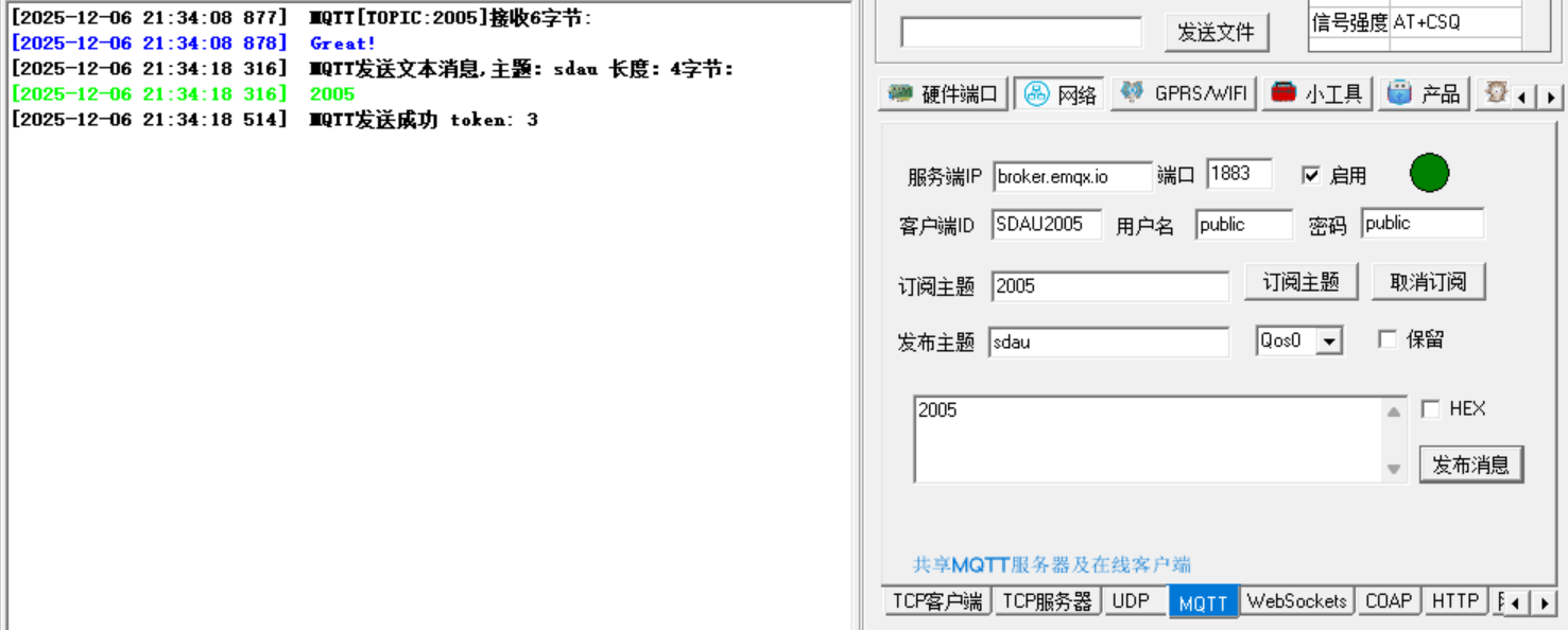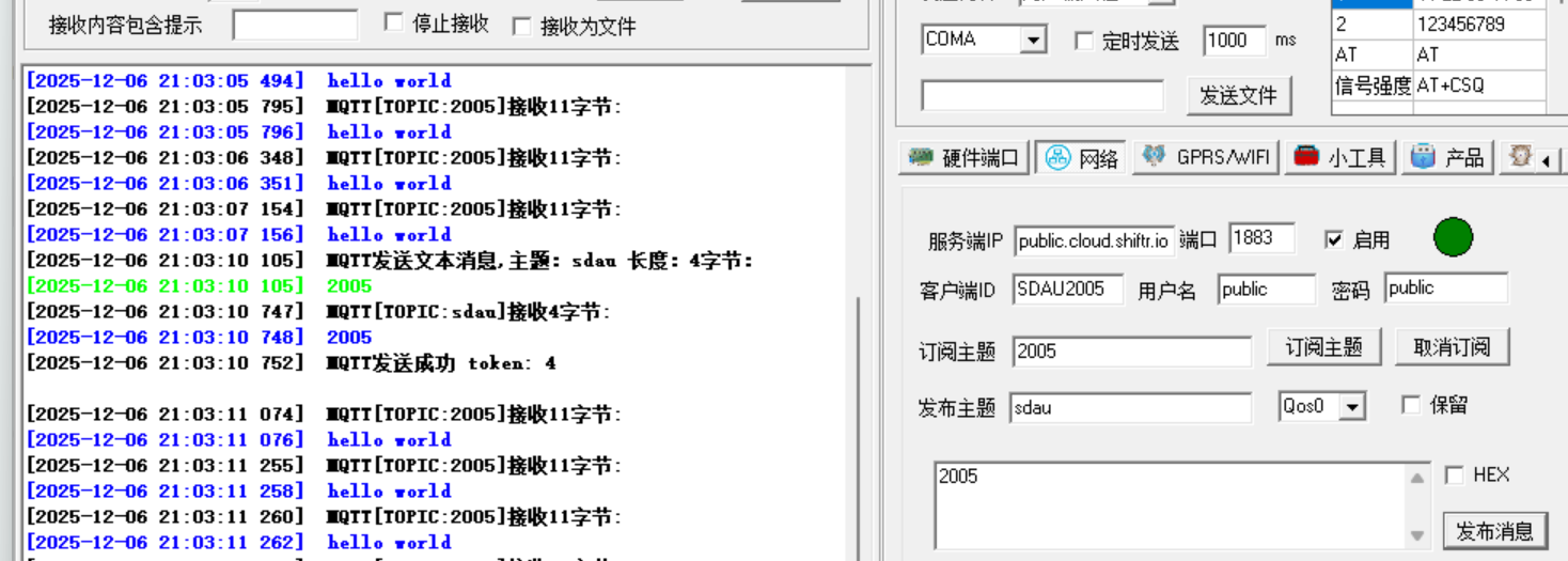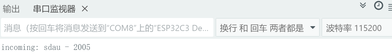 上传到ESP32C3小板,并打开串口监视器,波特率改为115200,同时通信猫订阅主题设为2005,并发布主题为sdau,内容为2005的消息,如下图所示,很明显可以看出ESP32C3和通信猫建立了通信联系。