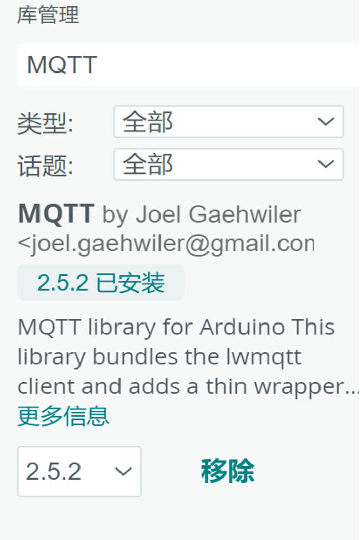 1.安装库:工具->管理库->库管理->填入"MQTT",选择"MQTT by Joel Gaehwiler",安装后效果如下: