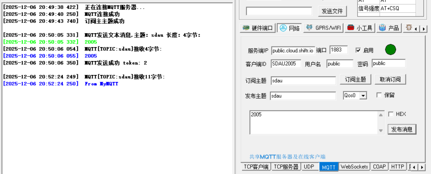 3.利用通信猫测试和MyMQTT测试免费MQTT Broker:public.cloud.shiftr.io,端口是1883,账号密码都是public,利用MyMQTT连接时要选择"MQTT V3"。