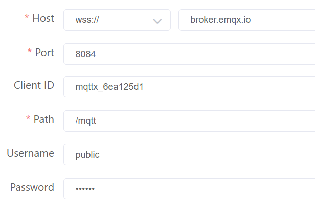7.推荐另外一个免费的MQTT Broker:broker.emqx.io,wss端口是8084,TCP端口1883,账号密码都可用public,操作界面如下: