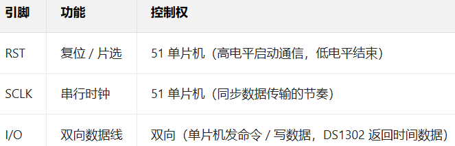 - 读取数据:单片机想显示时间时,才通过 3 线 SPI 接口发 "读命令",从 DS1302 的寄存器中读取当前的秒、分、时等数据;