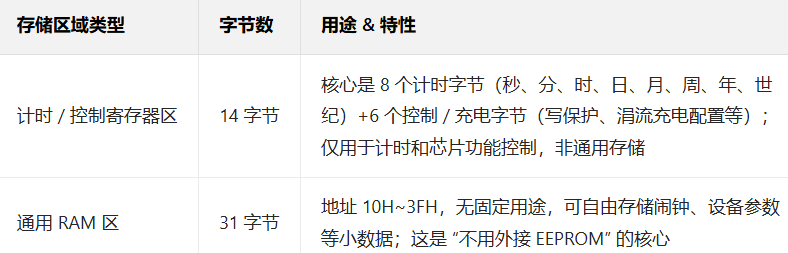 不用额外外接 EEPROM(掉电存储芯片),就能实现少量数据的掉电保存,节省硬件成本、简化电路设计(比如一个简易电子钟,只用 DS1302 就能同时实现 "计时 + 存闹钟",无需额外芯片)。