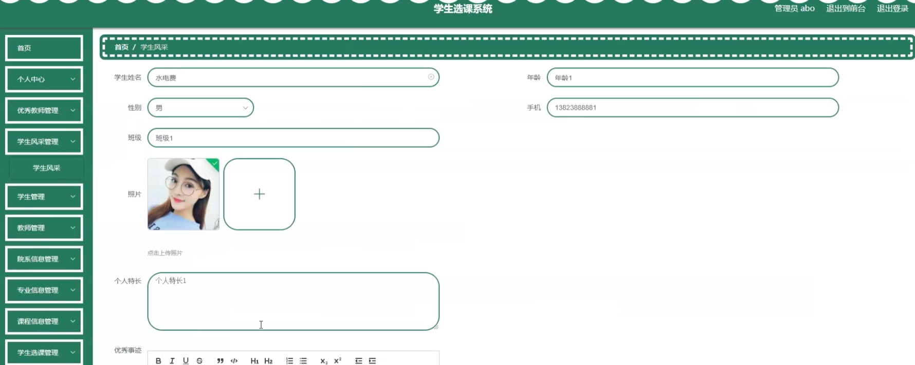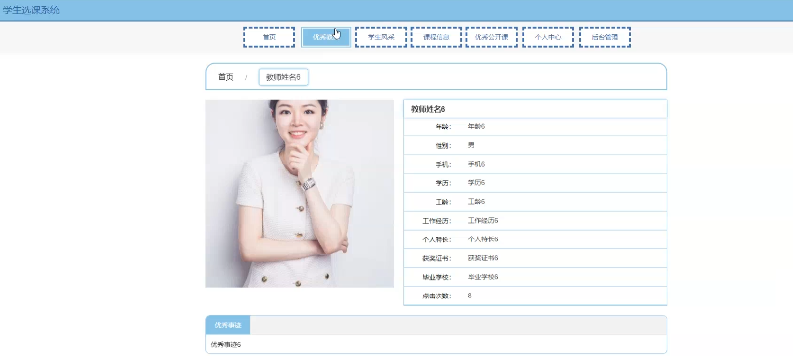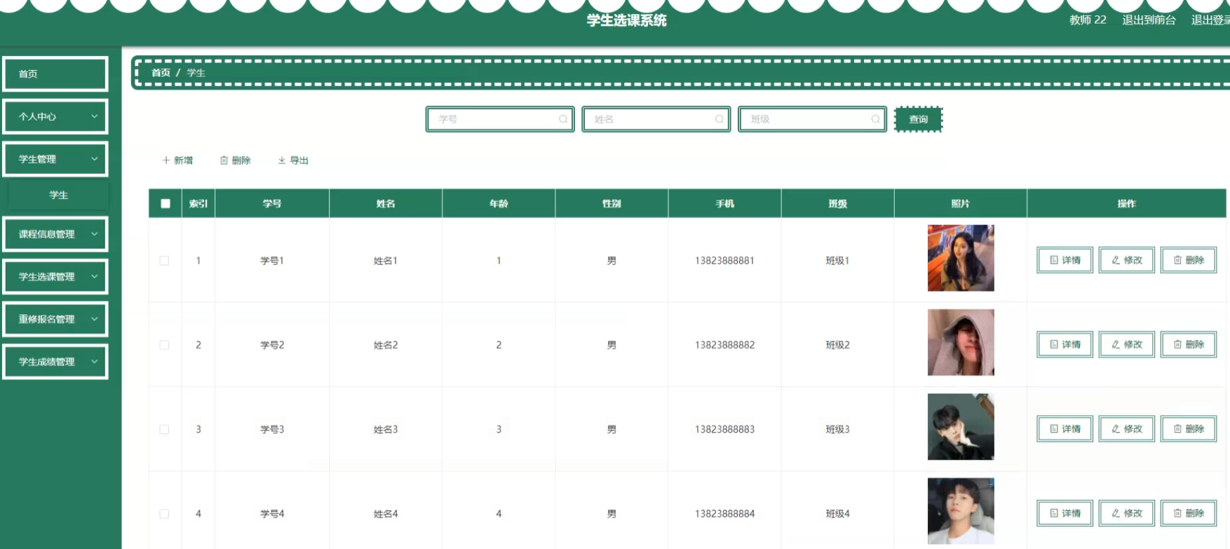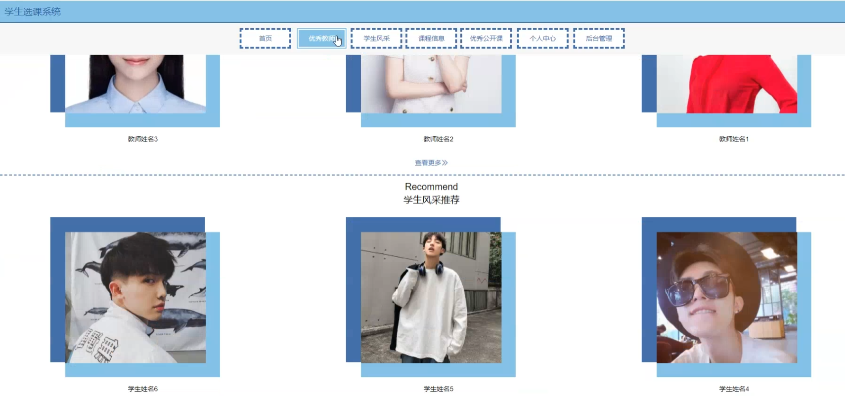 项目功能:优秀教师,学生风采,学生,教师,院系信息,专业信息,课程信息,学生选课,重修报名,优秀公开课,学生成绩,班级成绩