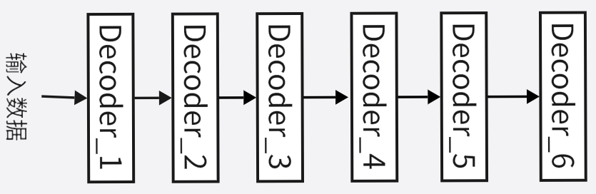 我们首先来介绍一下解码器部分的总体结构,也就是解码器堆栈。解码器堆栈也遵循解码器层间串行,层内并行计算的原则,首先是解码器层间并行,与编码器堆栈相同,第一个编码器输入接收词嵌入和位置编码的输出,其他编码器的输入为上一个编码器的输出,解码器堆栈也是如此。并且它的解码器(解码器层)个数也是6(Nx=6),解码器堆栈总体结构如下: