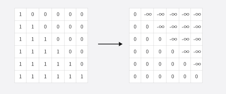 我们继续延用我们的例子,***sequence_length=6,***先生成一个6*6的下三角矩阵,再把下三角矩阵中0的部分换为负无穷,1换为0,过程如下: