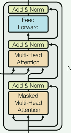 每个解码器由两个多头注意力层和一个前馈层组成,并且他们后都接了一个残差连接和归一化处理,可以观察到解码器的多头注意力层和编码器有所不同,接下来我们要详细介绍其中的细节。