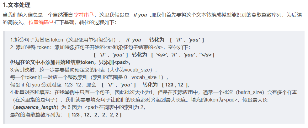 在前文我们介绍过token序列经过词嵌入和位置编码后作为编码器堆栈的输入数据,在解码器堆栈,它的输入数据同样要经过词嵌入和位置编码,但是存在一点不同。编码器的输入数据在未进行词嵌入和位置编码时的文本处理如下: