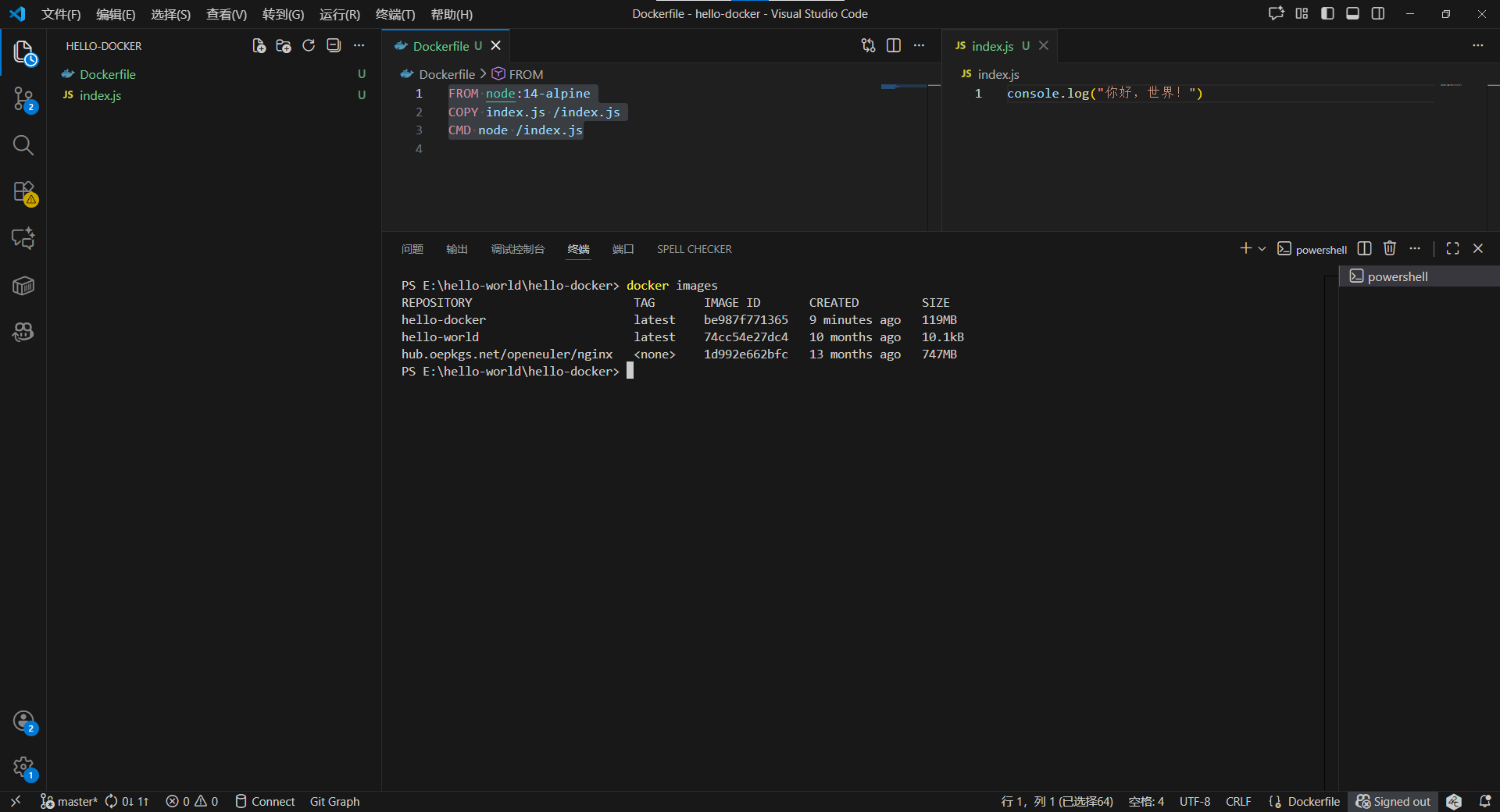 node:14-alpine(如果本地不存在) - 然后执行COPY指令,将index.js文件复制到镜像中