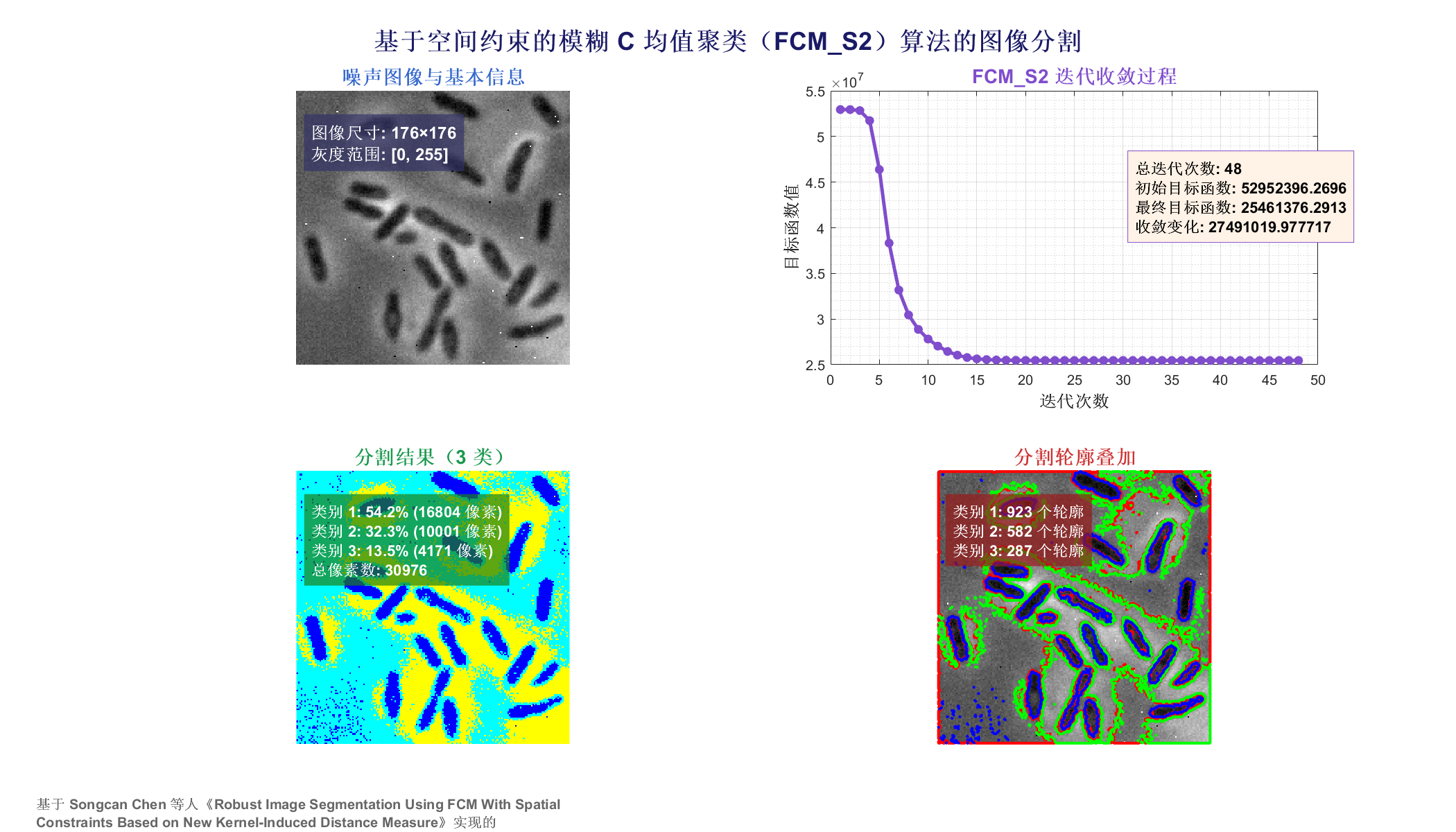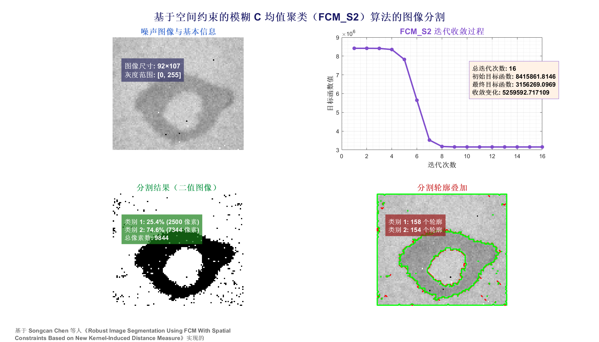 《Robust Image Segmentation Using FCM With Spatial Constraints Based on New Kernel-Induced Distance Measure》是由 Songcan Chen 和 Daoqiang Zhang 于 2004 年发表在《IEEE Transactions on Systems, Man, and Cybernetics, Part B》期刊上的一篇论文。该论文针对传统模糊 C 均值聚类算法及其带有空间约束的变体在图像分割中存在的两个关键问题------对噪声和离群点敏感,以及无法有效处理数据中非欧几里得结构------提出了一种创新的解决方案。核心方法是利用核方法,将原始数据隐式映射到高维特征空间,并基于此诱导出一类新的、鲁棒的非欧几里得距离度量,进而将原有的 FCM_S 系列算法扩展为对应的核化版本,即 KFCM_S、KFCM_S1 和 KFCM_S2。这种方法不仅通过核函数(如高斯 RBF 核)的固有特性增强了算法对噪声和异常值的鲁棒性,还能更好地揭示数据中复杂的非线性聚类结构,同时通过特定的设计保持了类中心在原数据空间的可解释性,从而在计算复杂度和直观理解之间取得了良好平衡。该方法因其出色的鲁棒性和对复杂数据的适应性,被广泛应用于医学影像分析(如 MRI 脑部图像分割)和受噪声污染的合成及真实图像的分割任务中,对后续结合核技术与空间上下文的图像分割研究产生了重要影响。