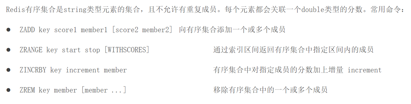 有序集合(sorted set / zset):集合中每个元素关联一个分数(score),根据分数升序排序,没有重复元素