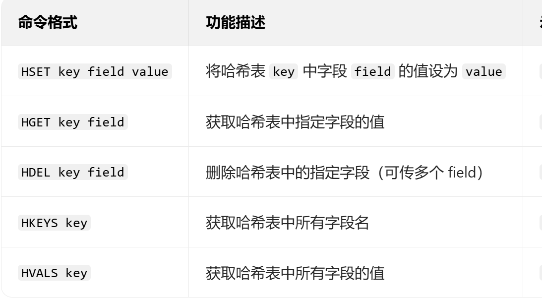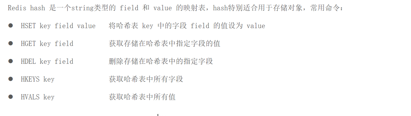 Redis hash 是一个string类型的 field 和 value 的映射表,hash特别适合用于存储对象,常用命令: