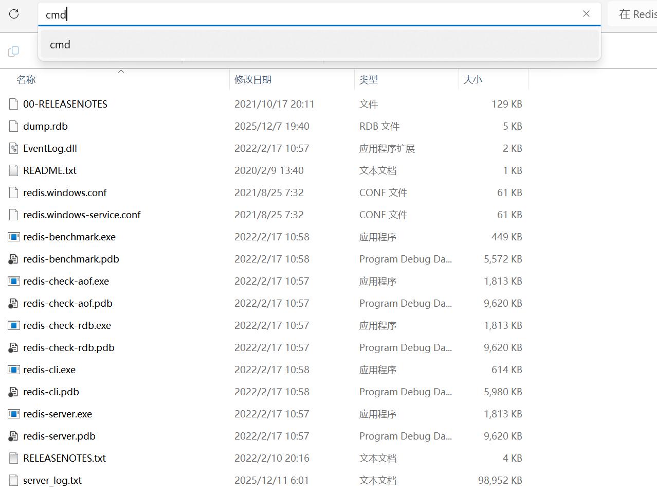 在redis目录中输入cmd,可以调出命令提示符窗口。
