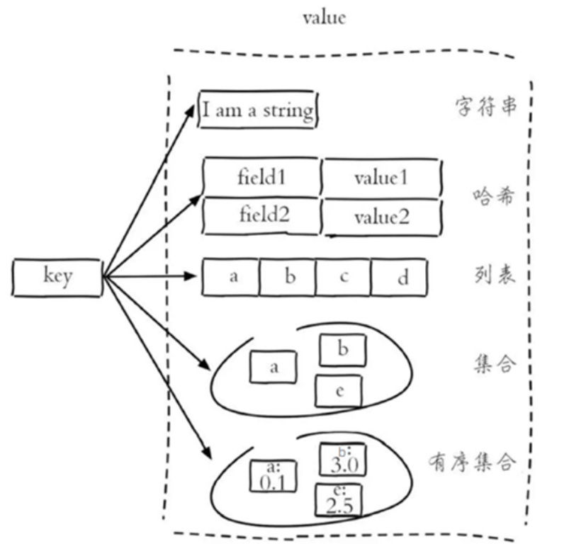 Redis存储的是key-value结构的数据,其中key是字符串类型,value有5种常用的数据类型: