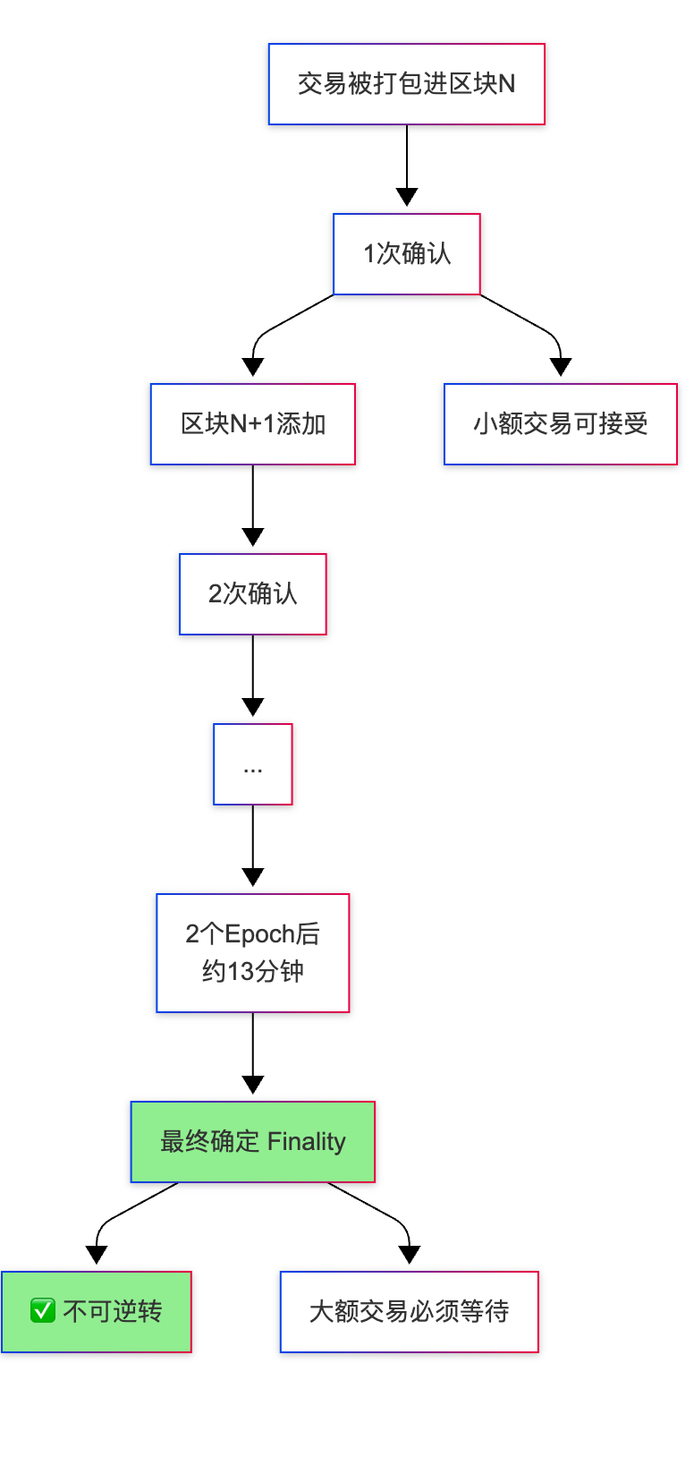 - 最终确定:~13 分钟(Finality)