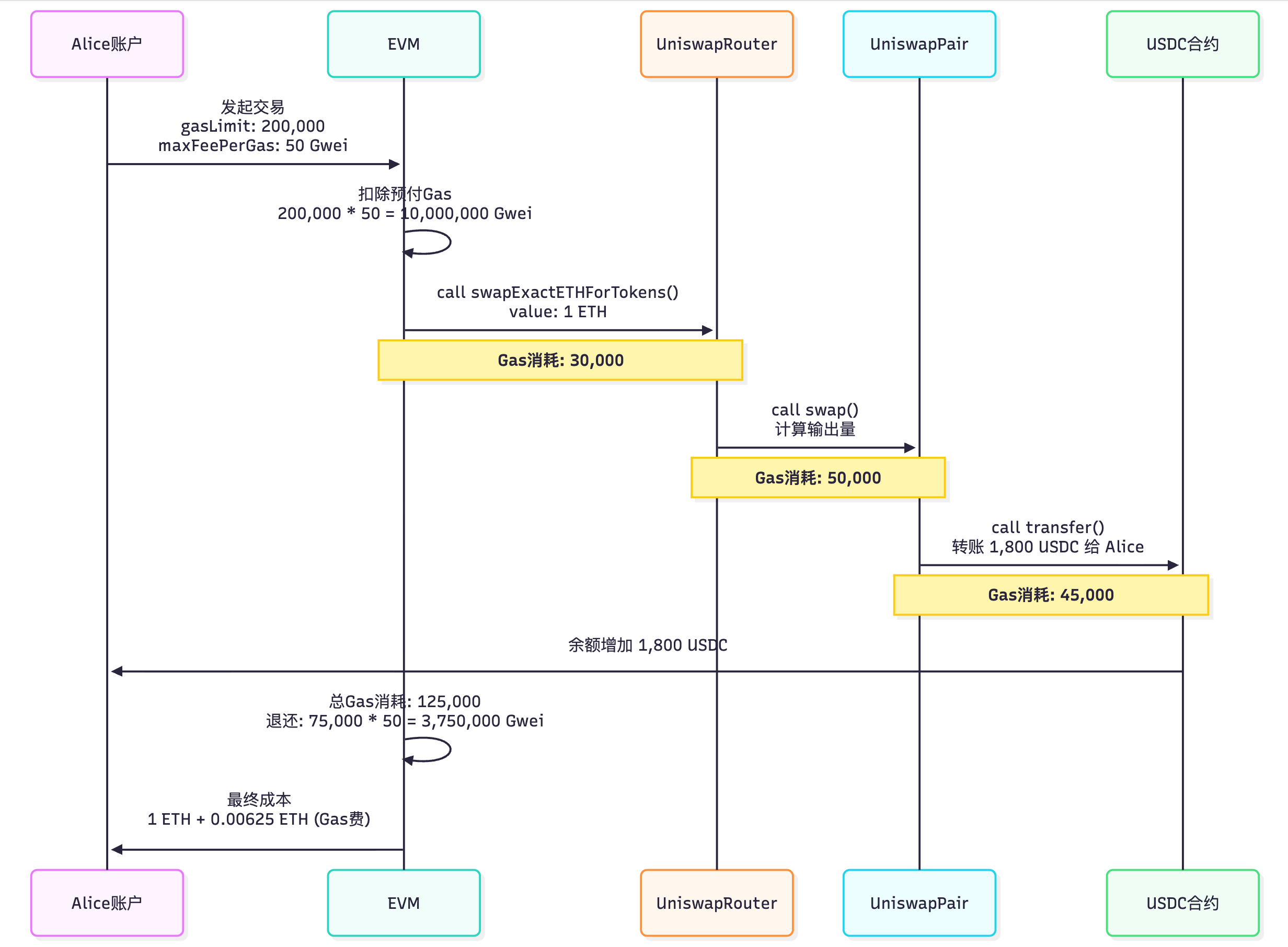 Alice 调用 Uniswap 交换 1 ETH → USDC