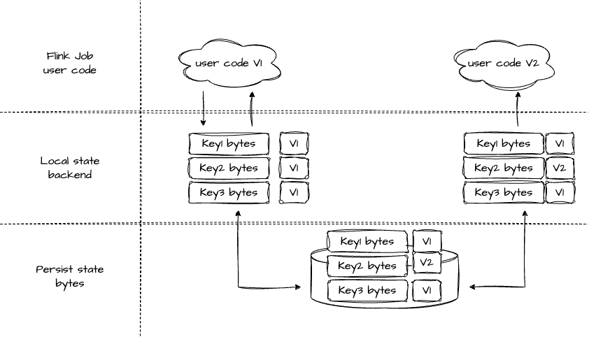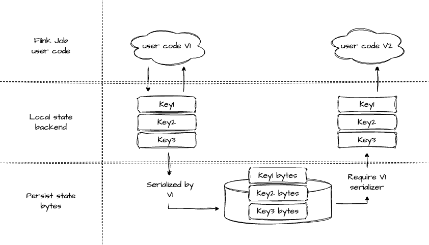 如果我们对程序进行了升级,这时要从 State 恢复的话,需要先将稳定存储中的数据进行反序列化,然后将结果加载到 TM 的内存中,供 user code 使用。
