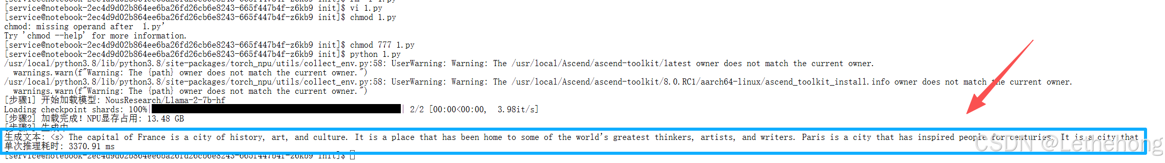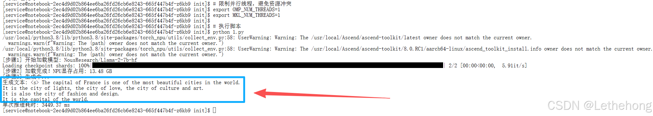 **预期成果:**终端将输出关于法国首都的完整句子,并显示具体耗时,证明NPU基础推理链路已打通。