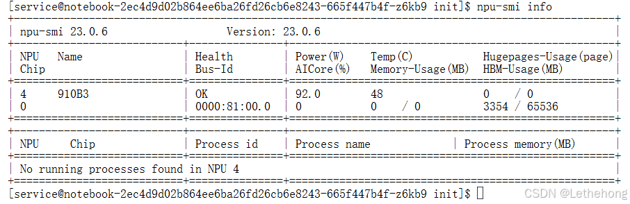 命令执行成功后,终端会列出NPU的详细状态信息,重点关注设备ID、温度、功耗和显存这几项关键指标: