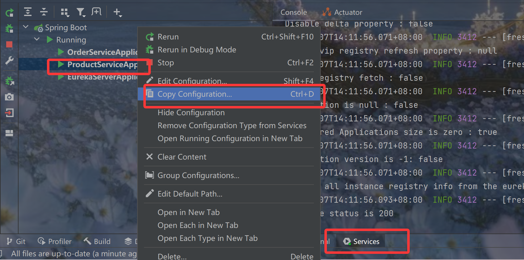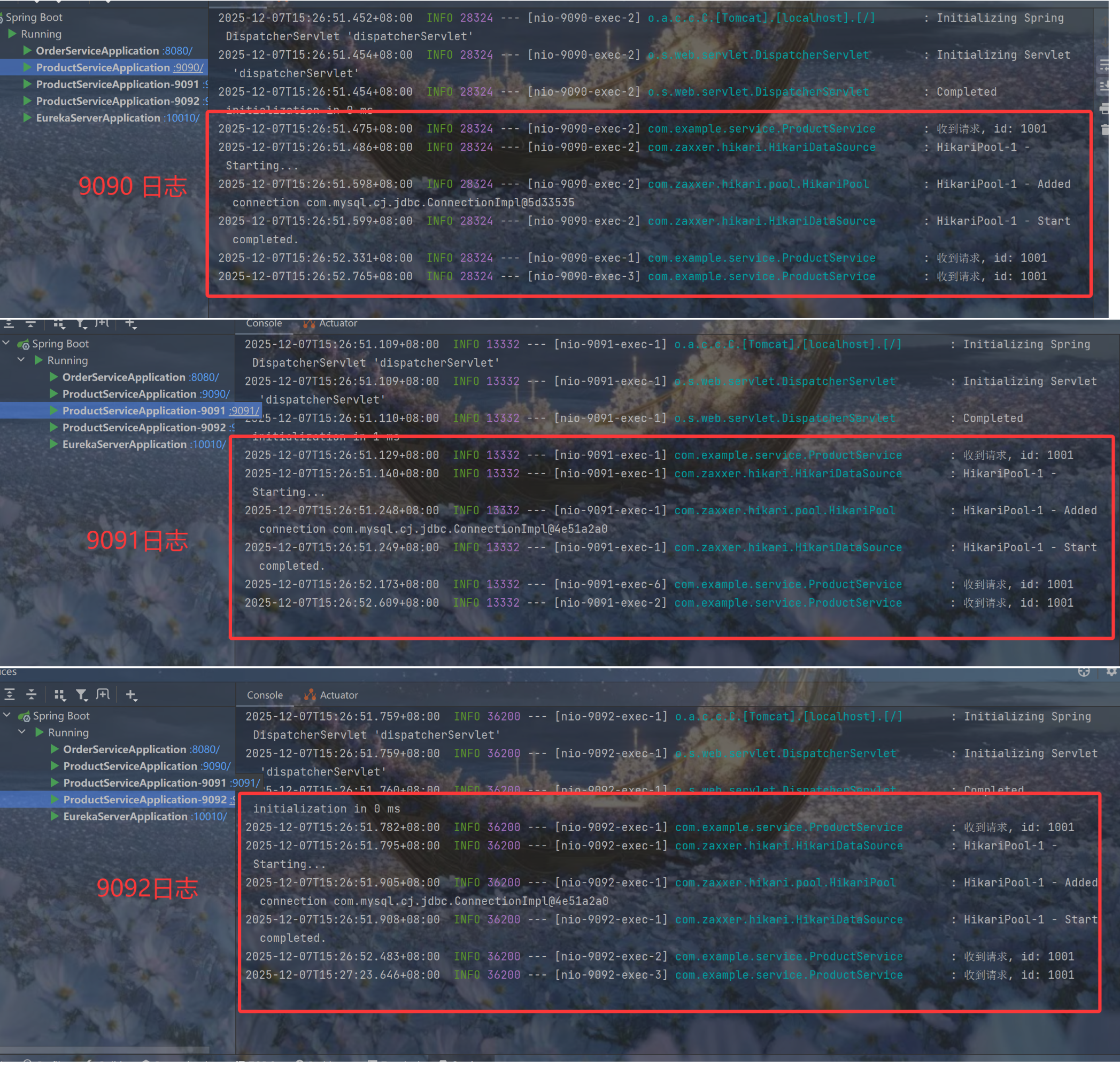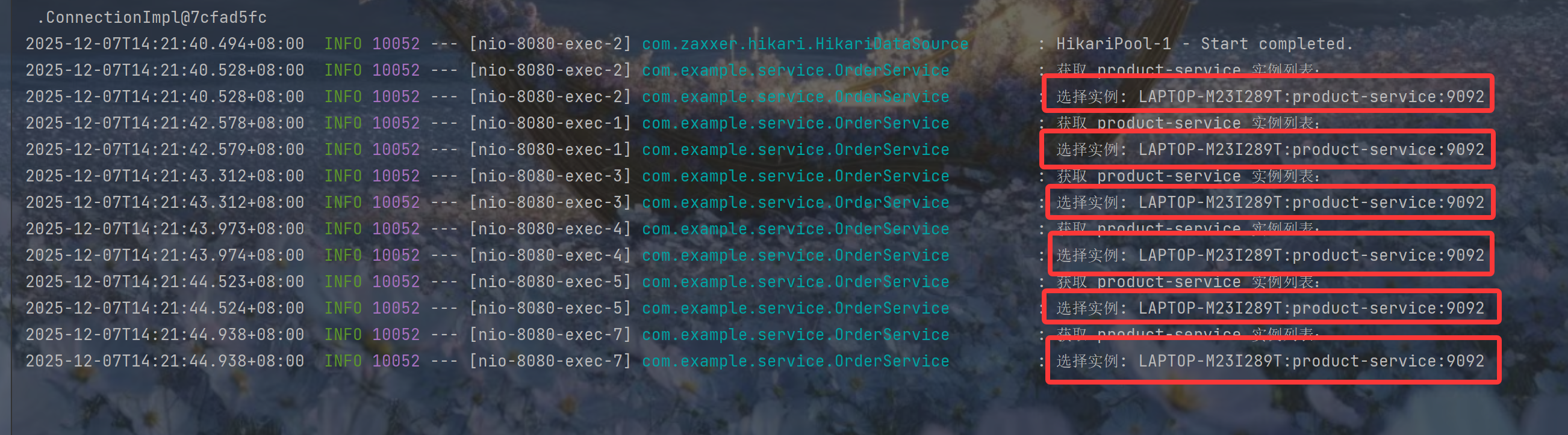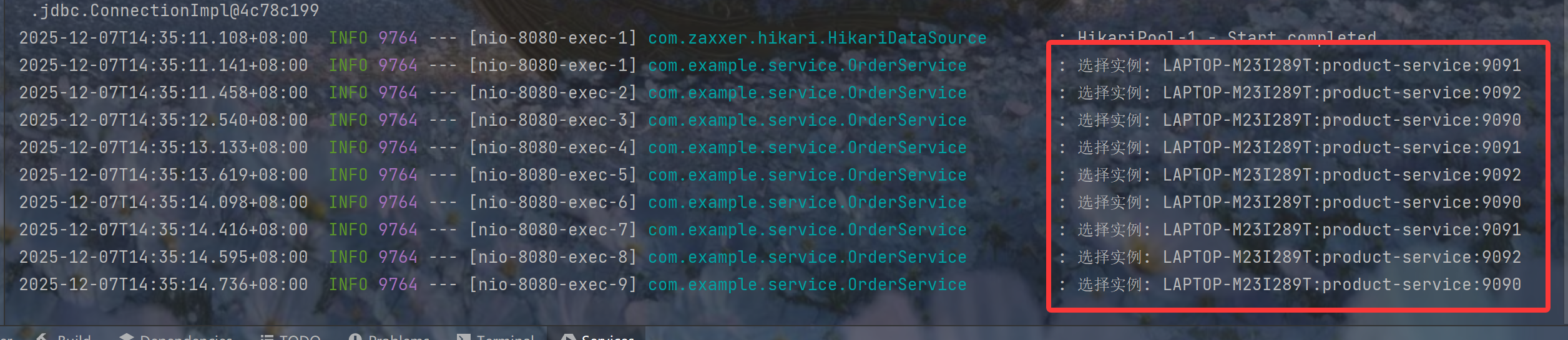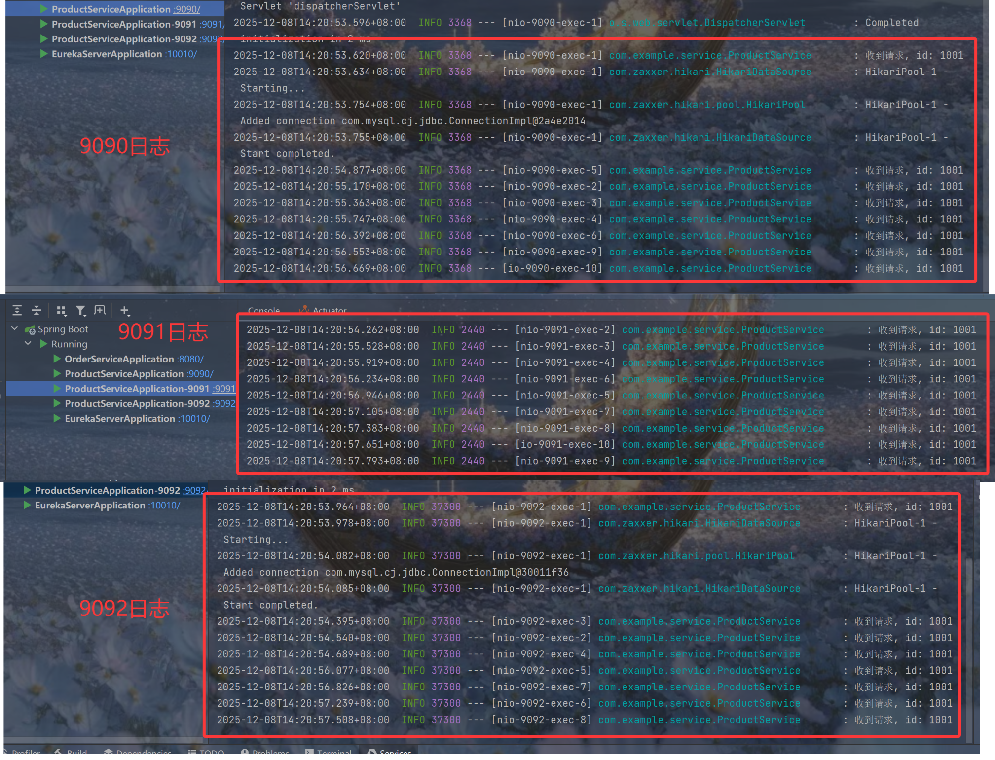 多次发起请求 127.0.0.1:8080/order/1,观察 product-service 的日志,可以看到请求被分配到这三个实例上: