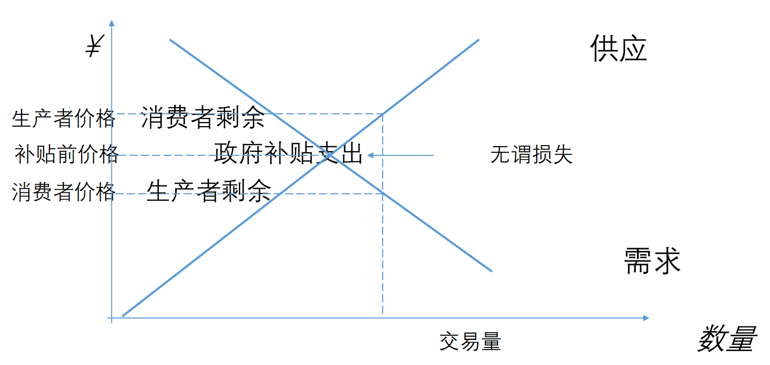 - 消费者剩余和生产者剩余都增加了,但是政府需要为此付出"政府补贴支出"(图中的大矩形)。而政府付出的这笔总开支,比消费者和生产者增加的福利总和还要大。超出的那部分,就是图上那个指向右边的"无谓损失"三角形。这部分损失的产生,是因为补贴促成了一些"不经济"的交易,这些新增加的交易的生产成本,其实是高于它们能为消费者带来的价值的。